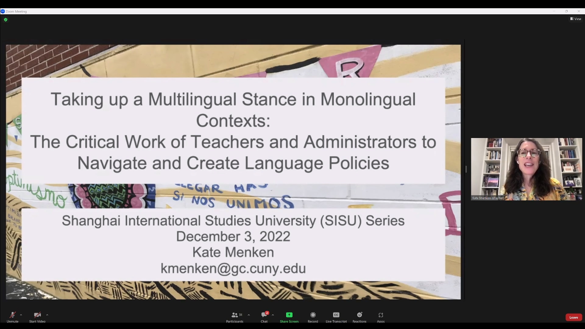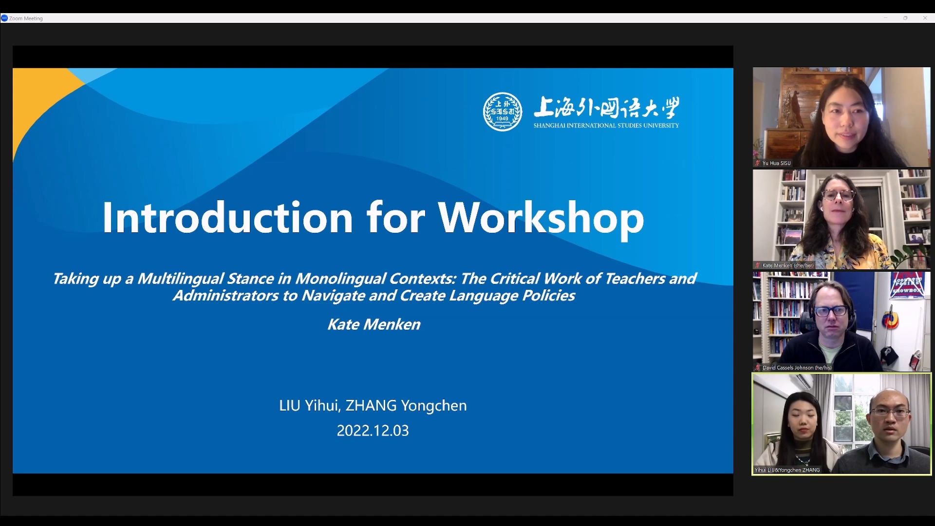 工作坊由中心副主任余华主持,美国纽约城市大学的Kate Menken教授做题为《在单语语境中采取多语立场:教师与管理者在引导和创建语言政策中的关键工作》的主题报告,美国爱荷华大学David Johnson教授进行学术点评与访谈,上海外国语大学的三十多位师生、爱荷华大学的部分师生参与活动。