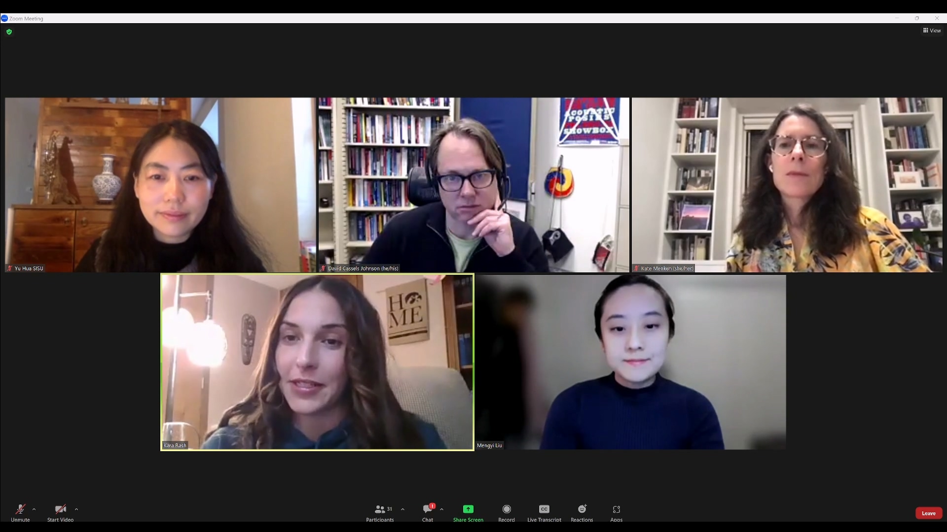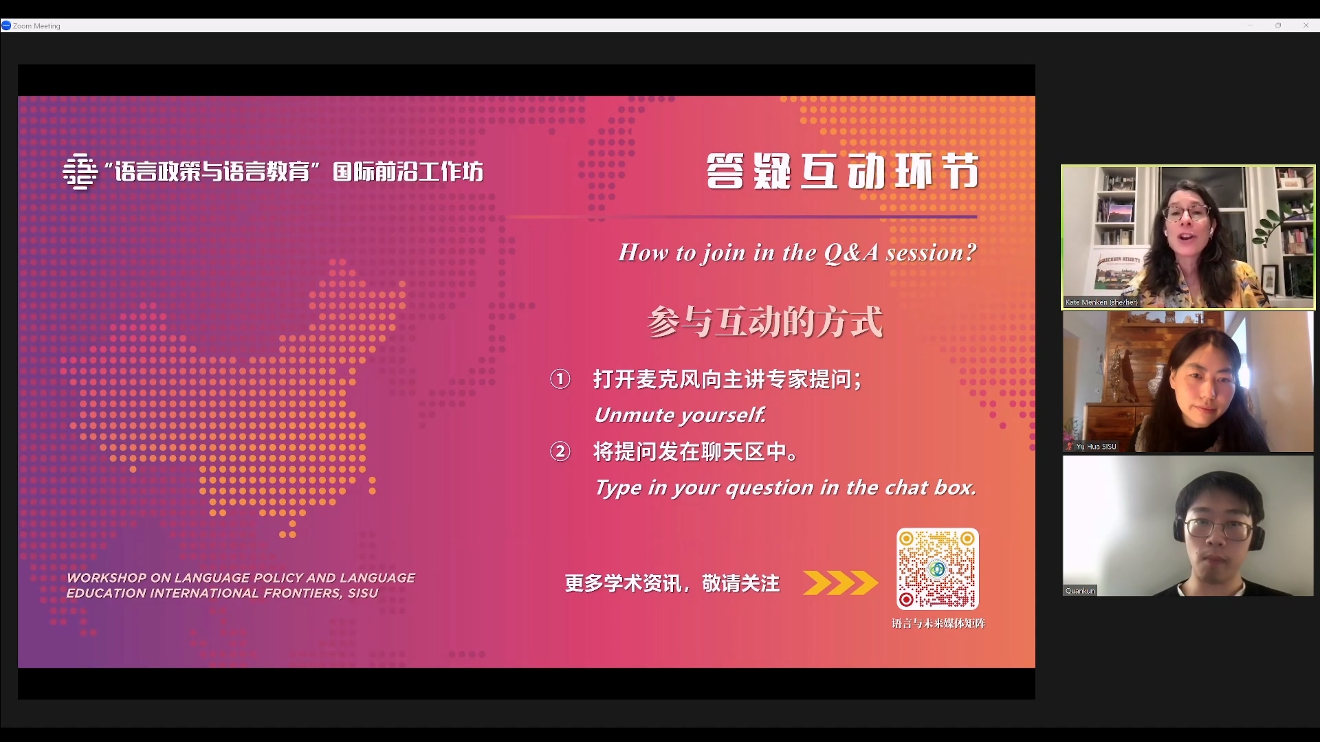 本次工作坊由引入介绍、主旨讲座、学术对谈及问答互动四个环节构成。中心的博士生张勇晨及硕士生刘熠辉对Kate Menken教授的学术背景、超语实践相关的基本概念进行了简要介绍,并提出他们在阅读Menken教授作品过程中产生的问题与思考。爱荷华大学的两位学生代表Kara和Liu Mengyi也对Menken教授在超语实践及双语教育领域的研究进行了介绍与分享。Menken 教授对四位学生的引入介绍及思考提问表示感谢及赞许。