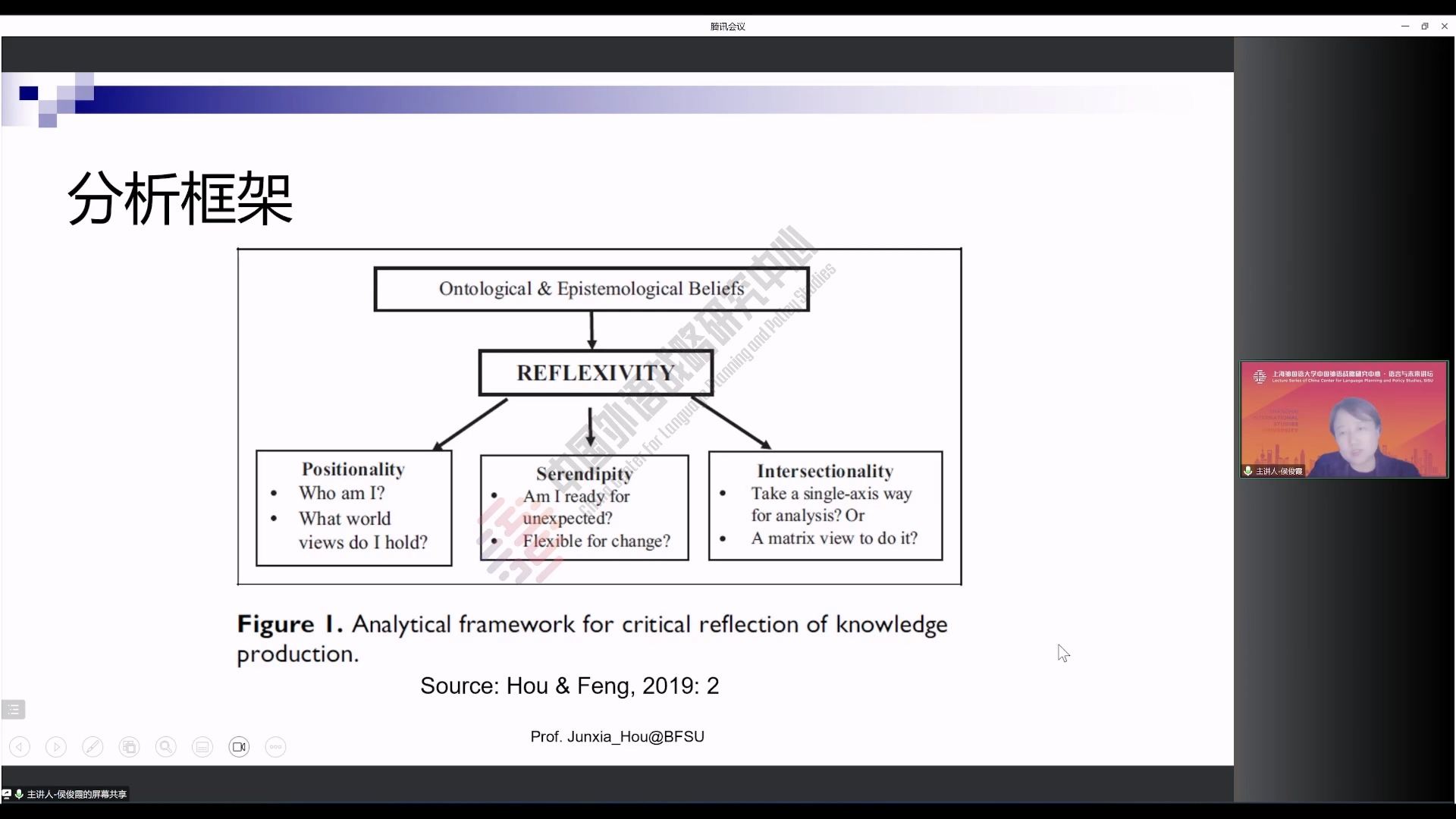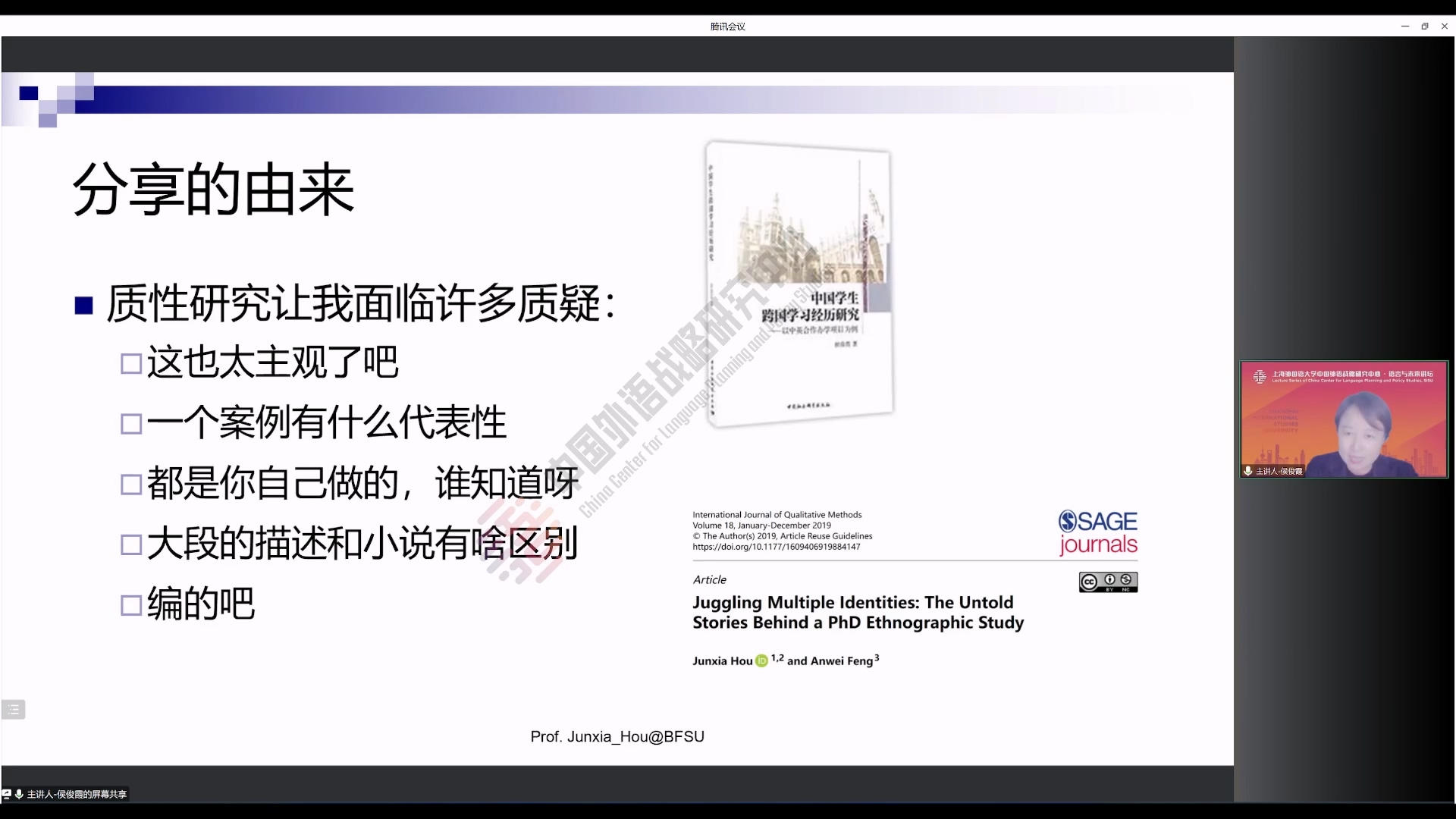 讲座伊始,侯俊霞教授阐释了质性研究的意义,指出研究者在社会建构中的多重身份具有流动性和复杂性。研究者作为研究工具,应客观地反思自身的“主观性”,并在研究知识创造的过程中保持批判性思维。接着,侯教授以“知识生产的批判性反思”分析框架为切口,呈现自己作为研究者,在中英两校的民族志研究中的身份变化,探究研究者身份构建的案例。侯教授指出,民族志研究者应阐明自己在特定研究时空中的定位,在“局内人”和“局外人”之间保持平衡,并聚焦自身作为独立的个体与社会环境相互协商的过程和结果。她认为民族志研究是研究者在不同的身份角色重构中创造知识的过程,作为民族志研究的“中间人”,自己兼具“研究者”和“非正式研究参与者”的非二元对立身份,在跟随参与者探索跨文化的旅程中与其产生共性,深入了解参与者的同时,也更新了反身性体验和意义阐释,从而促进了“反思型研究者”的诞生。基于此,侯教授进一步探讨了主客体角色融合与研究可信度之间的关系,并倡导广大研究者们在多重身份间穿梭和重建的过程中,大胆地还原“混乱的”“真实的”“完整的”田野故事,作出“如何在身份流动中,保持民族志研究的中立性和客观性”的批判式深入反思。