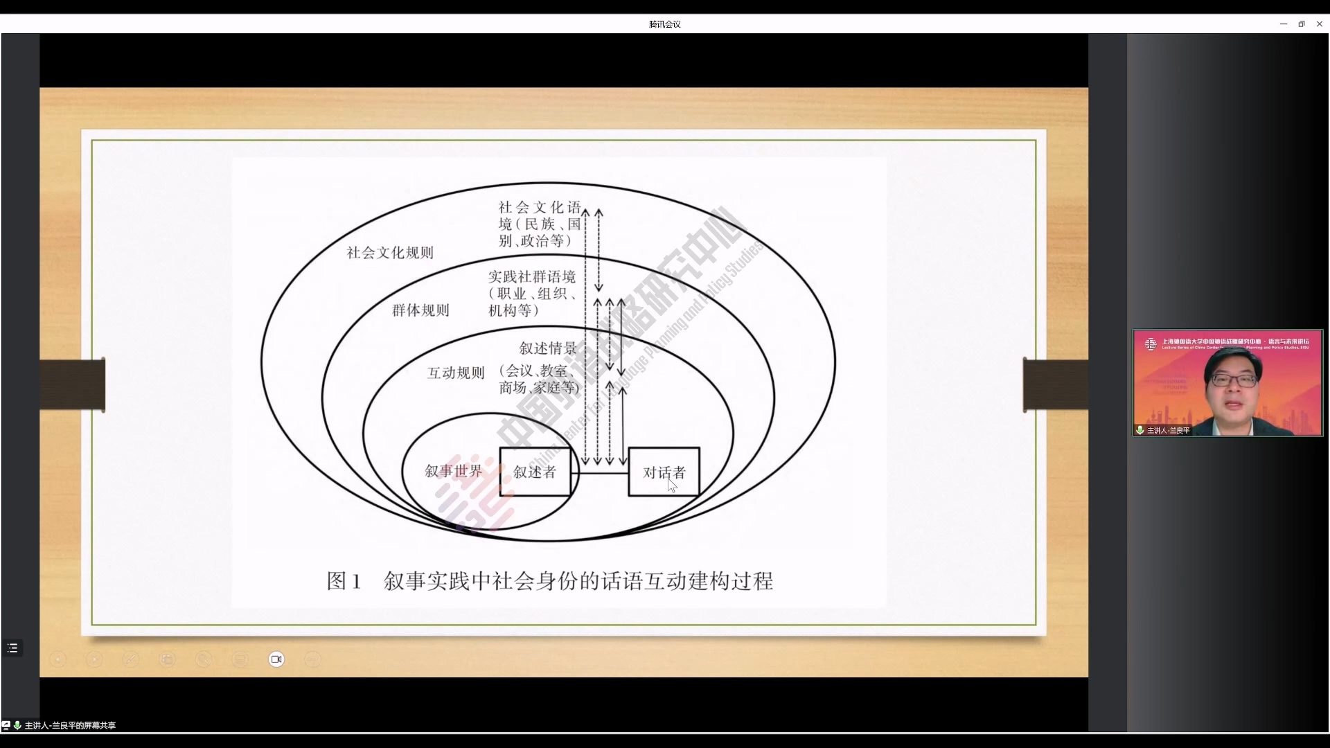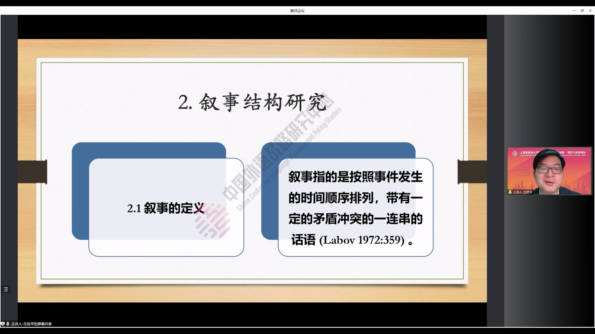 2023年5月11日,浙江师范大学兰良平教授做客上海外国语大学中国外语战略研究中心“语言与未来”讲坛,做了题为《中国英语学习者会话叙事的话语分析》的学术讲座。讲座由中国外语战略研究中心副主任余华副教授主持,近400位校内外师生在线参加。