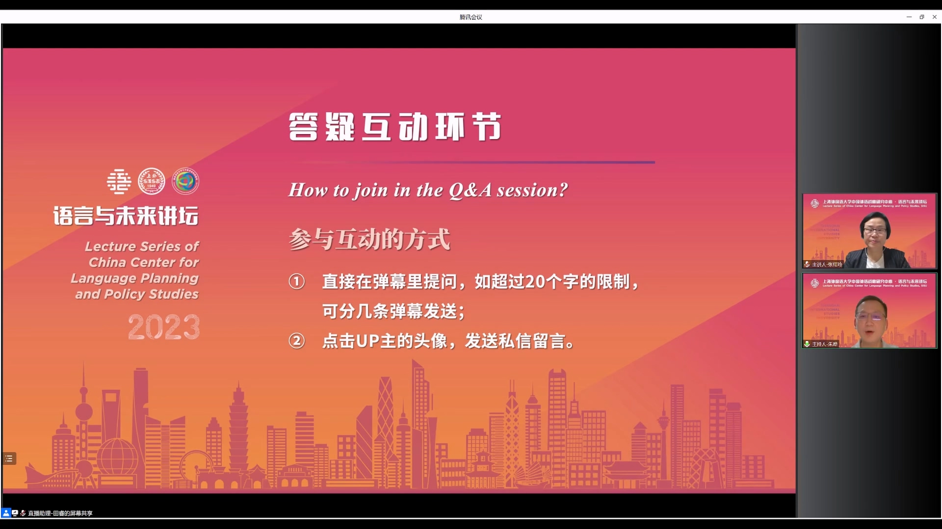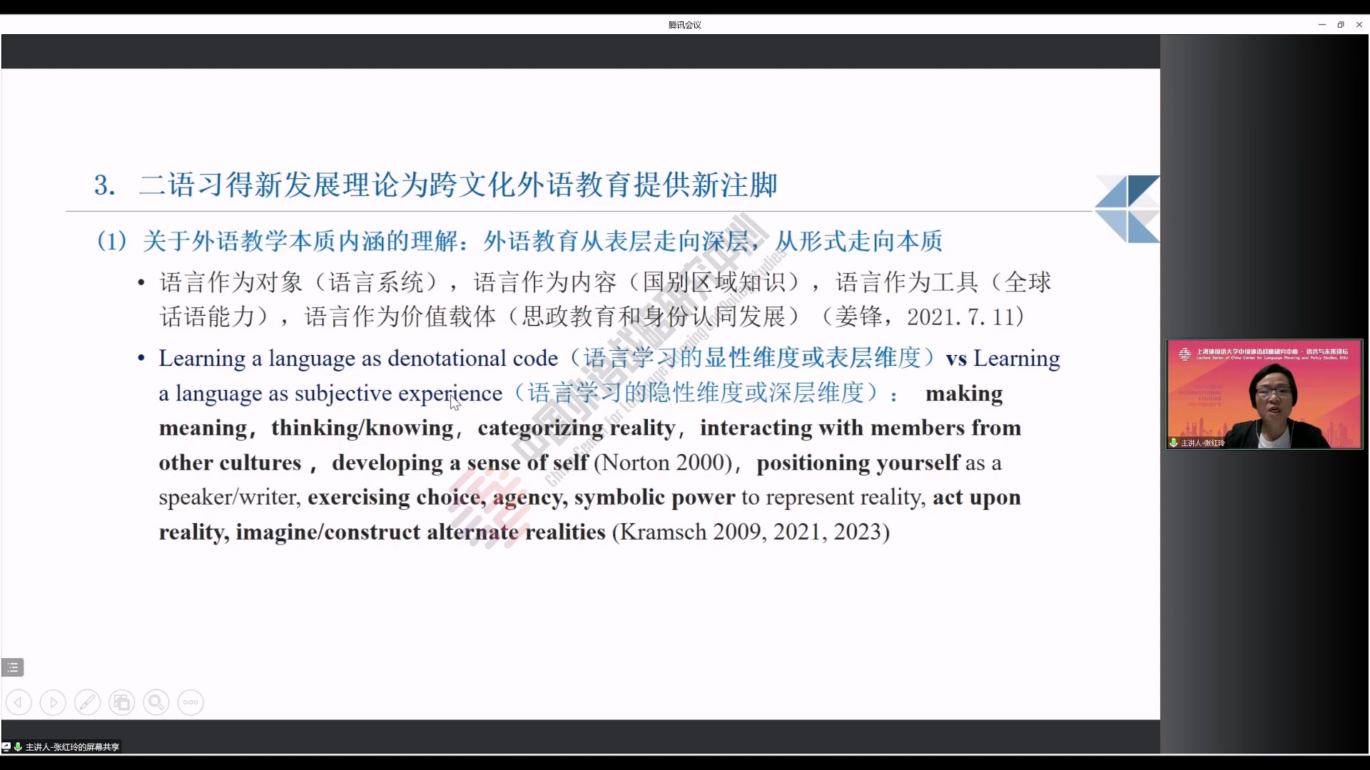 在讲座最后的互动环节,在线观众与张红玲教授进行了积极而融洽的互动。张红玲教授耐心解答了听众提出的关于在中小学外语课堂中展开跨文化外语教育、跨文化外语教育的实证研究情况以及跨文化外语教育对于文化深层次问题教学的问题。这次讲座提升了在场听众关于跨文化外语教育的学术视野和理论水平。
