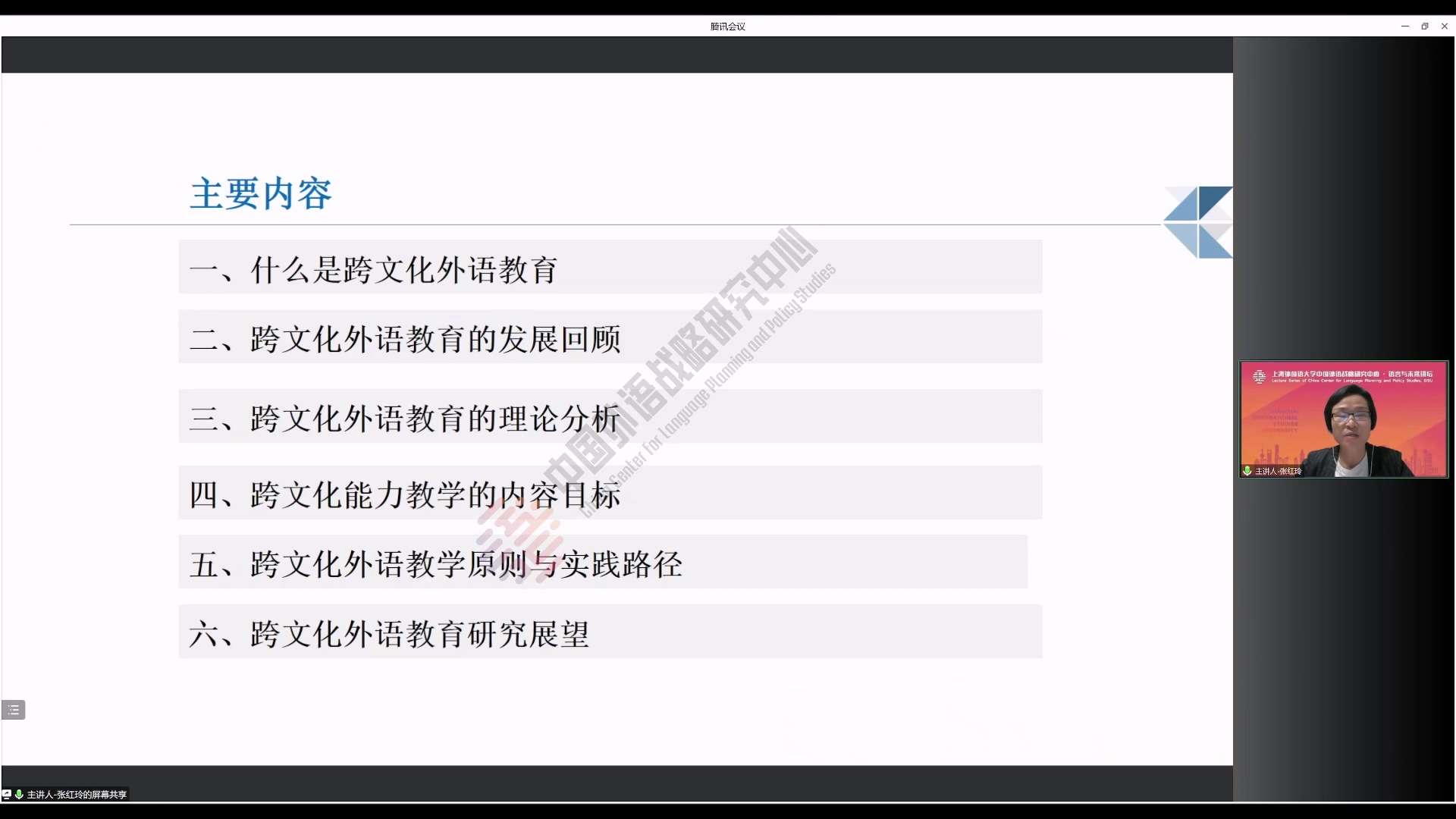 2023年6月15日晚,上海外国语大学跨文化研究中心主任、中国跨文化交流研究委员会副会长、美国富布莱特研修学者、明尼苏达大学和杜克大学访问学者张红玲教授做客中国外语战略研究中心的“语言与未来”讲坛,做了题为《跨文化外语教育新发展研究》的学术讲座。讲座由中心副主任朱晔教授主持,来自全国各大高校和研究机构的近500位师生在线参加。