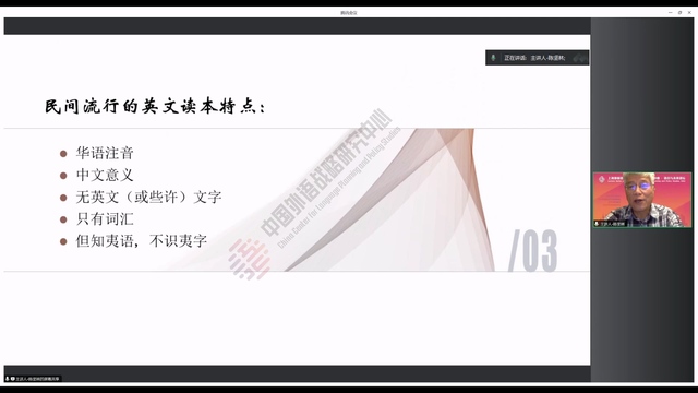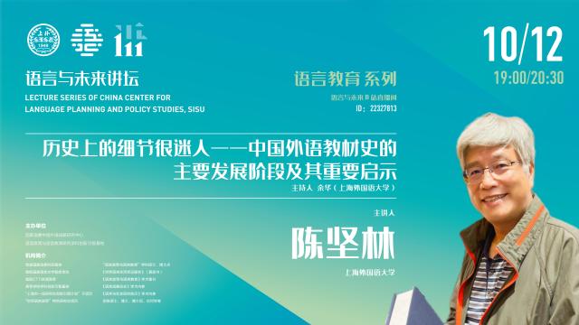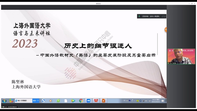 2023年10月12日晚,上海外国语大学陈坚林教授做客中国外语战略研究中心“语言与未来讲坛”,做了题为《历史上的细节很迷人——中国外语教材史的主要发展阶段及其重要启示》的学术讲座。讲座由中心副主任余华副教授主持,近400位来自全国各大高校和研究机构的师生以在线的方式参加了本次讲座。