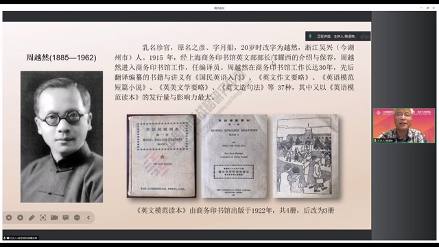 在讲座中,陈坚林教授着重梳理了晚清至民国时期中国英语教材的发展历程。讲座伊始,陈教授首先展示了鸦片战争前后中国民间流行的诸如《红毛鬼话》《英字入门》等英语读本以及英语学习顺口溜,指出这一阶段的英语教材有着“华语注音”“中文意义”“无英文(或些许)文字”“只有词汇”等特点。之后,陈教授以1862年京师同文馆的成立作为中国外语教材进入正规阶段的起点,并先后介绍了汪凤藻、张德彝、严复等为中国早期英语教材发展发挥了重要作用的人物以及他们的贡献。随后,陈教授又讲述了民国时期中国英语教材,详细介绍了周越然与《英语模范读本》、林语堂与《开明英语读本》、林汉达与《初中标准英语读本》《高中标准英语读本》等具有鲜明代表性的人物与教材,并总结出民国时期的教材具有“词、句、篇循序渐进”“内容丰富”,以及体现了直接教学法、情境教学法、功能意念法等特点。最后,陈教授探讨了清末民初的外语教材对今天中国外语教材的启示。