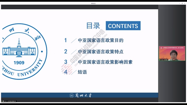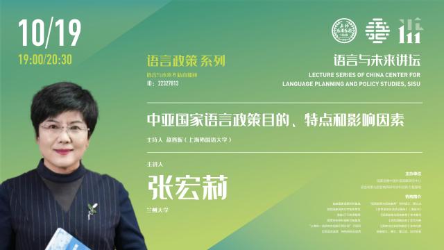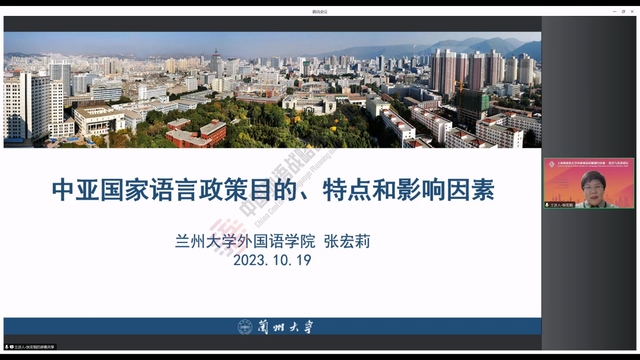 2023年10月19日晚,兰州大学外国语学院张宏莉教授做客中国外语战略研究中心“语言与未来讲坛”,做了题为《中亚国家语言政策目的、特点和影响因素》的学术讲座。讲座由中心执行主任赵蓉晖教授主持,近600位校内外师生在线参加。
