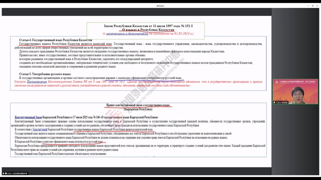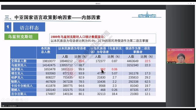 张教授指出:满足政治需求、加强民族认同和国家认同是中亚国家语言政策的目的,尤其是在主体民族语言的合法化和制度化方面。张教授认为,中亚国家语言政策有两个特点:一是以立法形式确立主体民族语言的国语地位,俄语地位高低不一,二是制定专门的《国语法》或国语发展纲要,全面提高国语功能。她从历史沿革的角度阐述了独立30年来中亚五国在主体民族语言和俄语之间寻找平衡的过程,并指出近年来有国语代替俄语成为族际交际语的趋势。