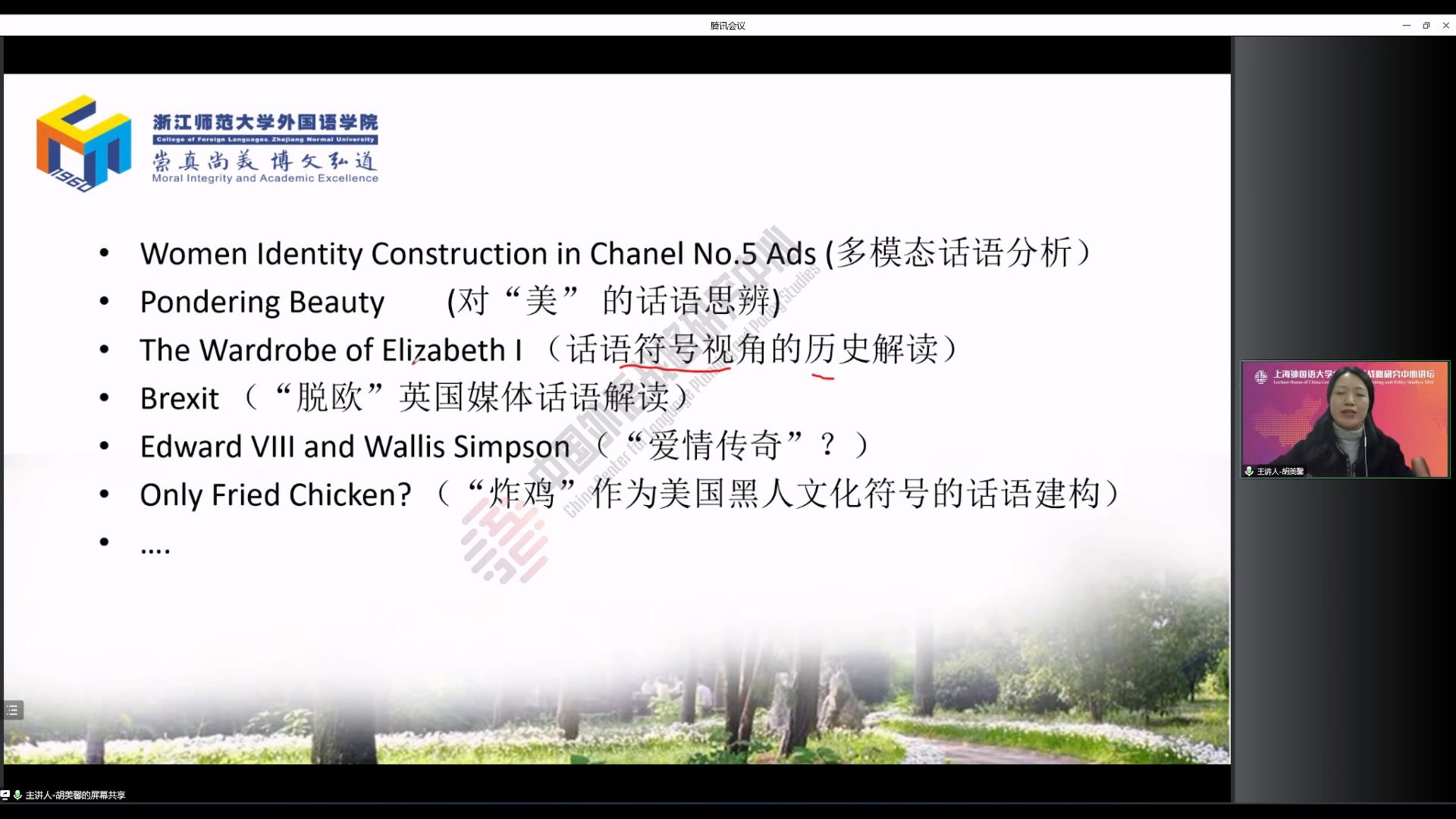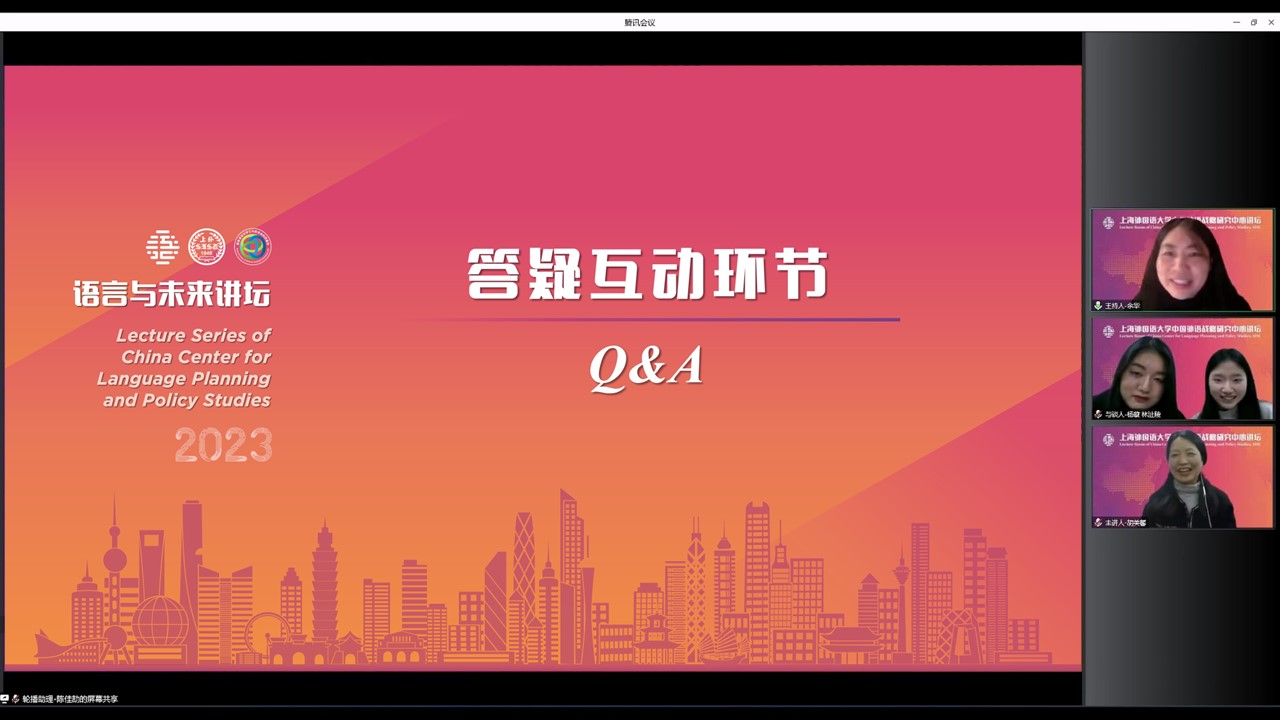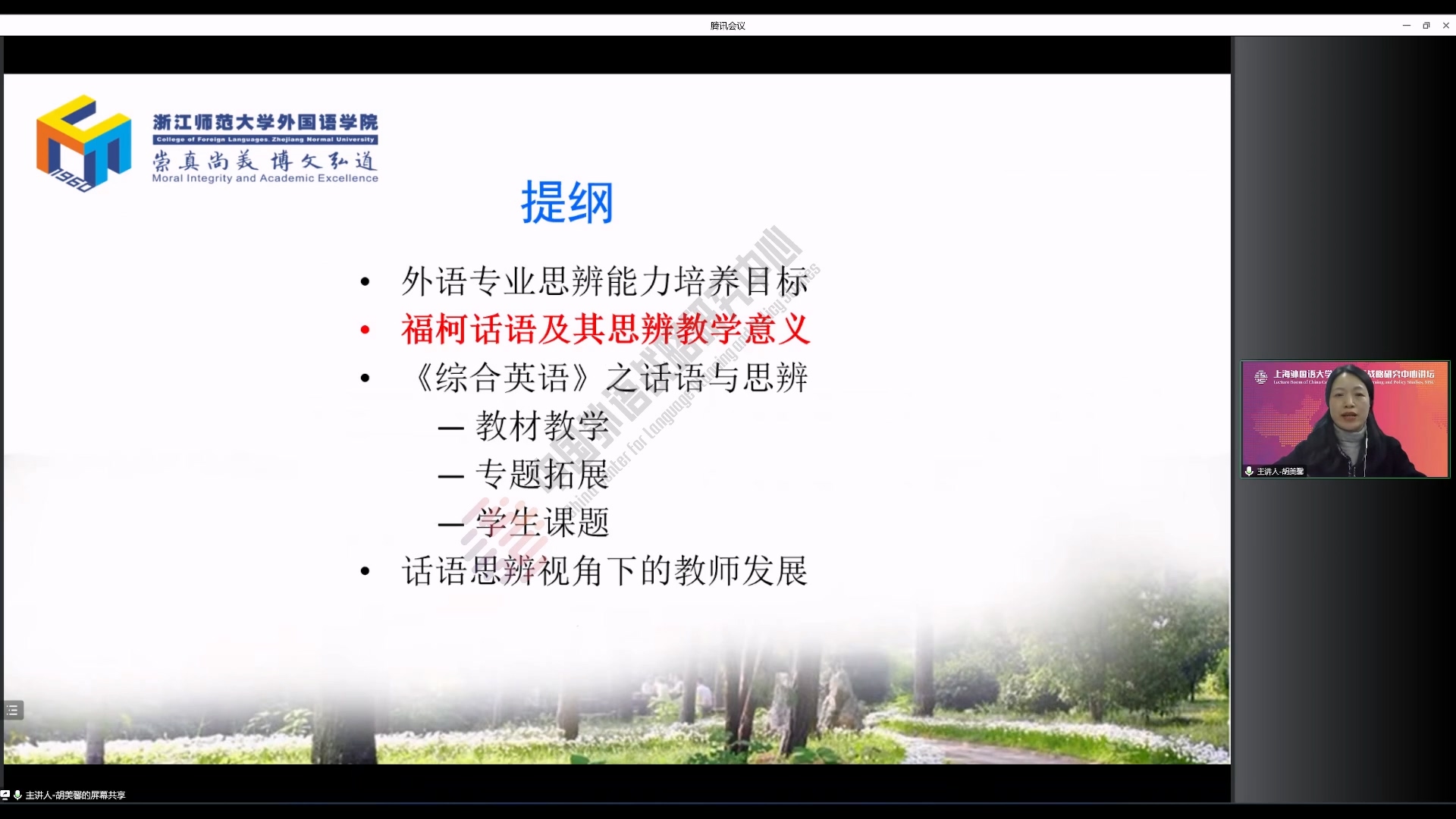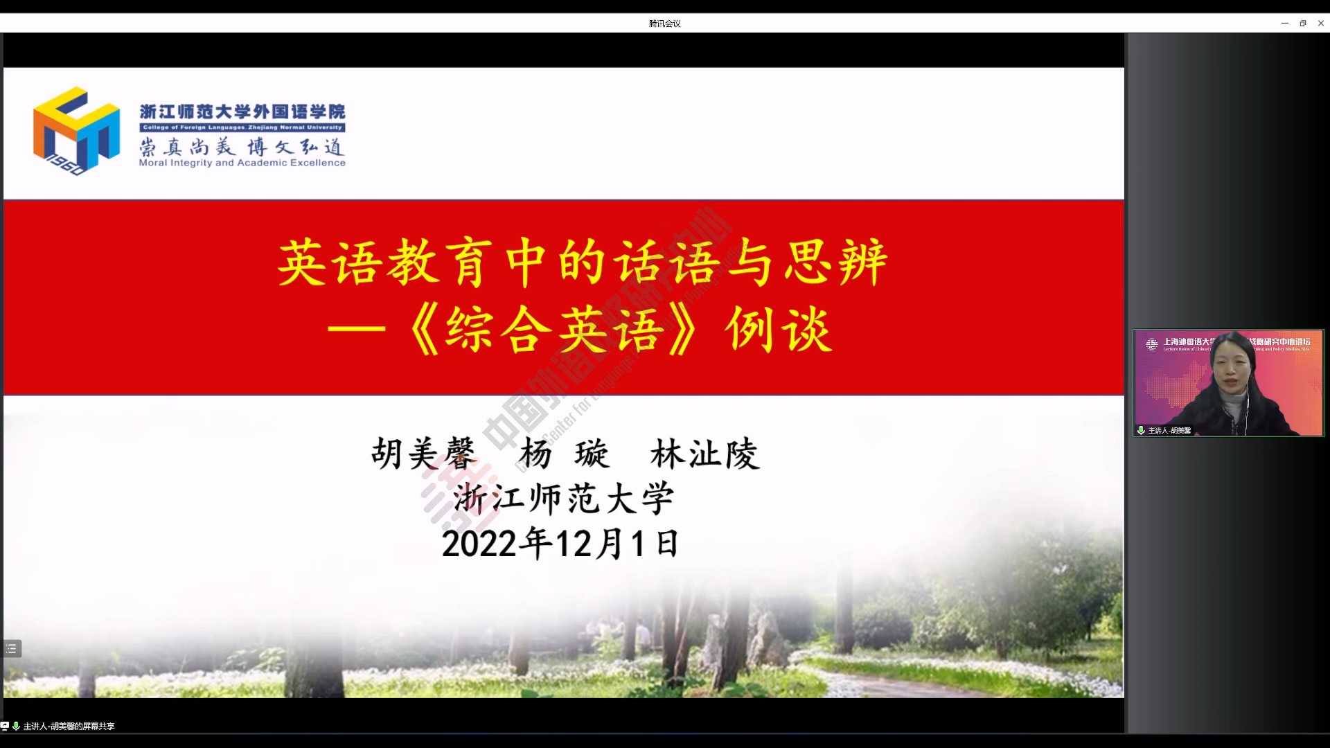 2022年12月1日晚,浙江师范大学“双龙学者”、特聘教授胡美馨做客“中国外语战略研究中心讲坛”,做了题为《英语教学中的话语与思辨——“综合英语”例谈》的学术讲座。本次讲座由中心副主任余华副教授主持,来自各地的师生在线参加本次讲座。
