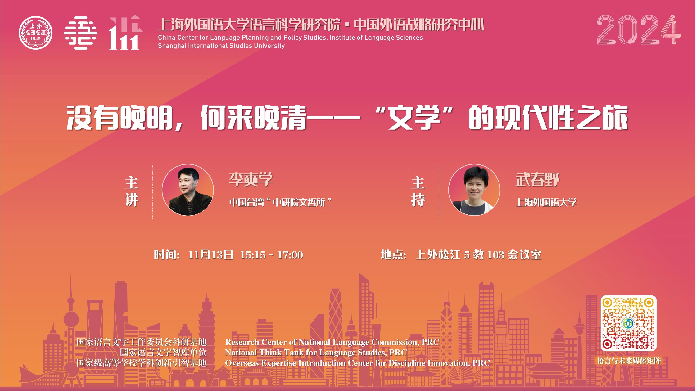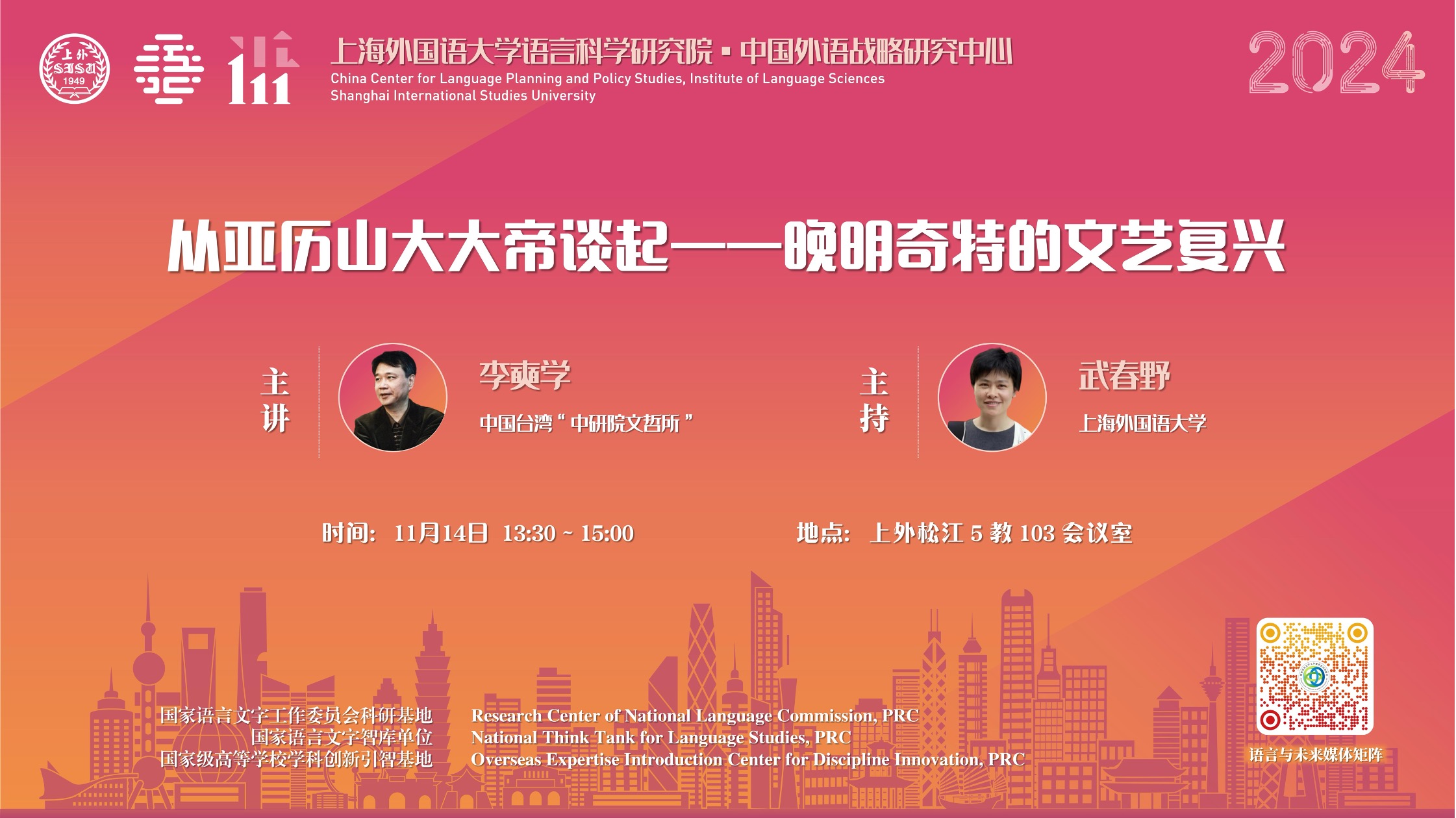 2024年11月12日至14日,中国台湾“中研院文哲所”特聘研究员、台湾师范大学翻译研究所合聘教授、台湾辅仁大学跨文化研究所校聘讲座教授李奭学老师莅临上海外国语大学,为上外师生带来了三场讲座。讲座由上海外国语大学语言科学研究院、国家语委科研基地中国外语战略研究中心承办。讲座围绕“语言与社会变迁”为主题展开,为师生呈现了一场融合语言学、文学、翻译史、中西文化交流史的学术盛宴。