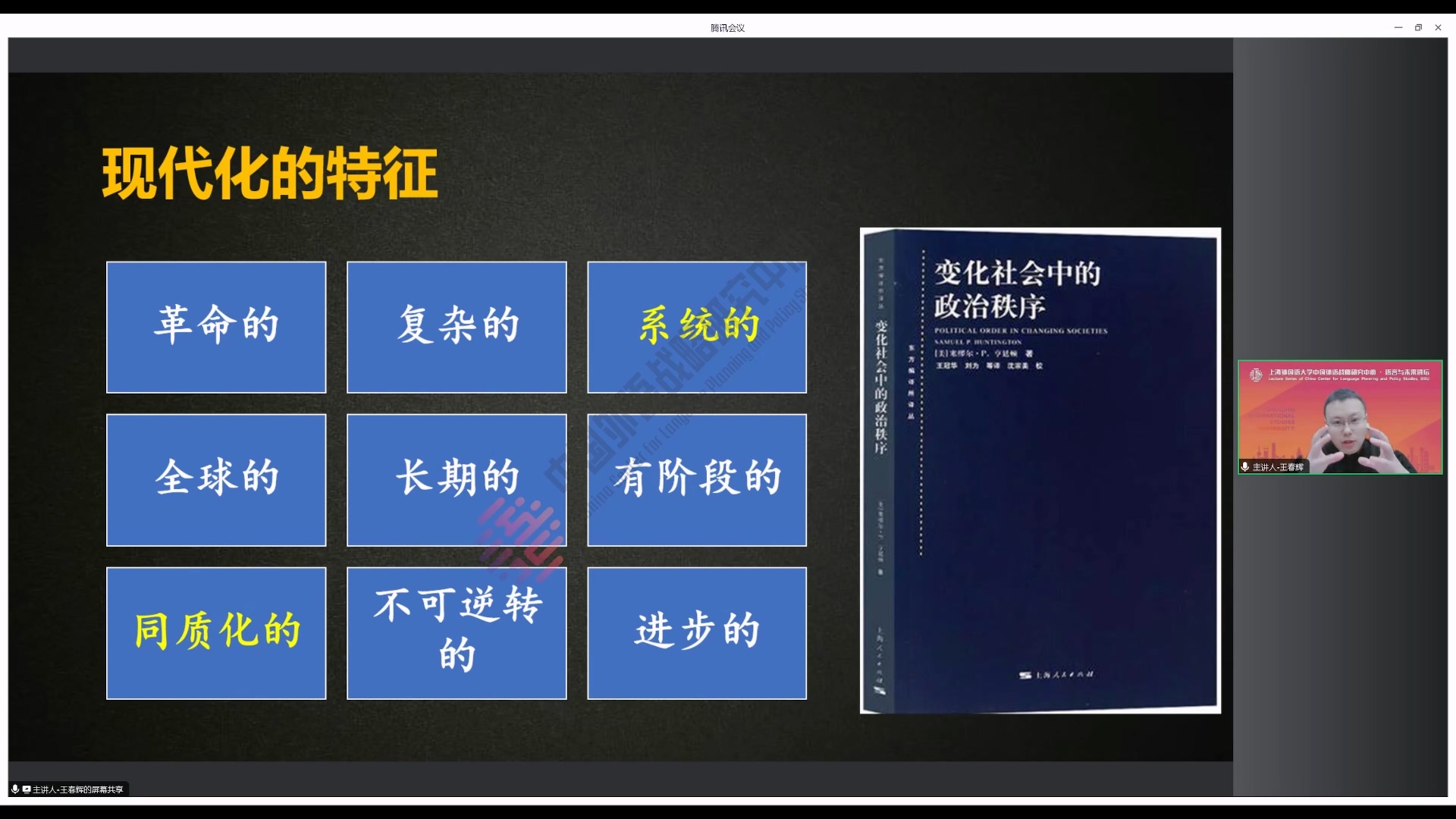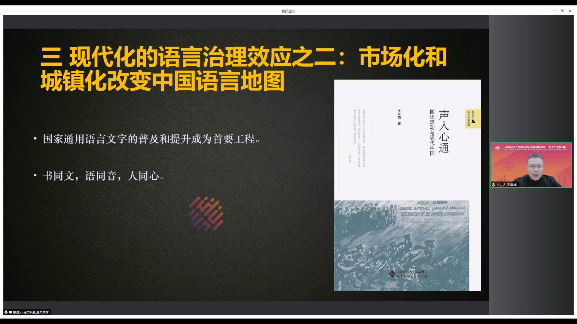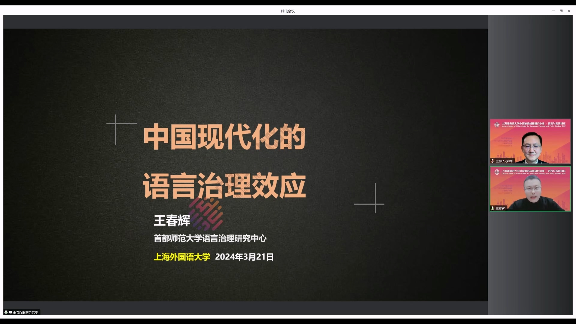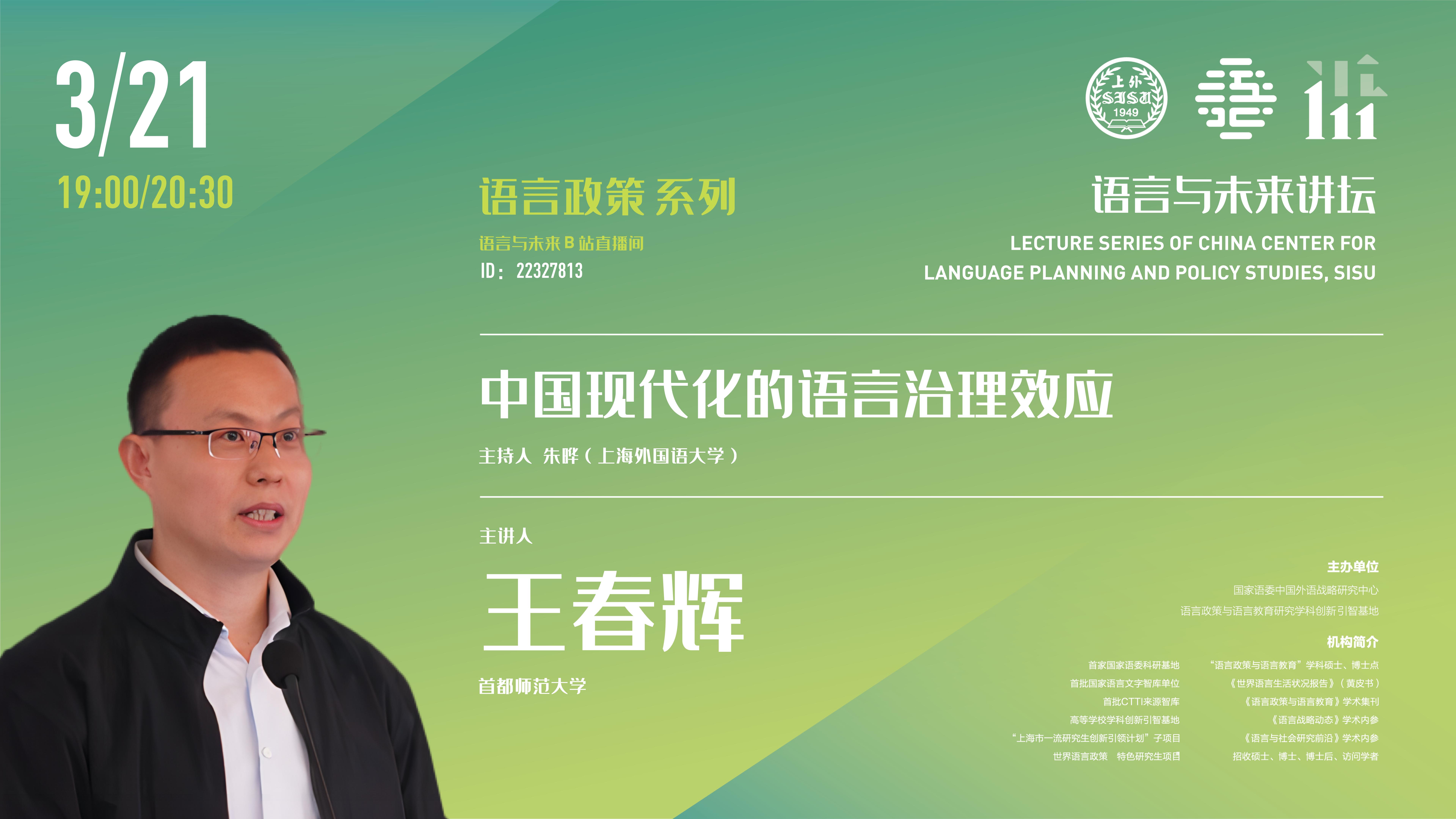 2024年3月21日晚,首都师范大学国际文化学院教授、语言治理研究中心主任、国家语委语言治理研究融智协同创新中心负责人王春辉教授做客中国外语战略研究中心“语言与未来讲坛”,作了题为《中国现代化的语言治理效应》的学术讲座。讲座由中国外语战略研究中心副主任朱晔教授主持,400余位线上听众参与此次讲座。