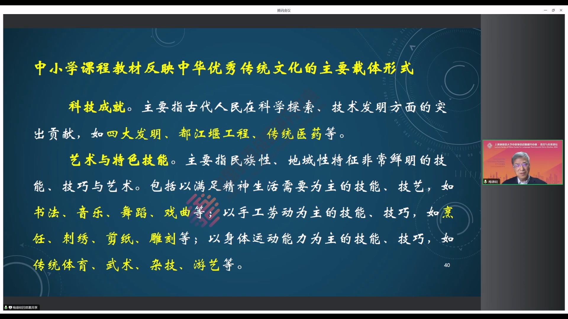 在讲座中,梅德明教授由党的二十大报告中“坚定文化自信,坚守中华文化立场”这一要求引入,首先介绍了课题研究者的使命与担当,即“尺寸教材,国之大者;教材建设,国家事权”,提出研究团队站位要高、方向要明、目标要准。接着,梅教授介绍了教材建设的根本遵循,应紧紧围绕立德树人根本任务,弘扬优良传统,用心打造培根铸魂、启智增慧的精品教材。最后,梅教授以与中华文化融入相关的优秀项目为例,着重介绍了项目申报和课题研究的基本构成,包括研究的基本内容、框架结构、基本思路和方法,拟突破的重点和难点问题等等,强调项目申请人及其研究团队应树立问题导向、目标导向和创新导向的课题意识,促进中华文化在外语教材中的有效融入与呈现,讲好中国故事。