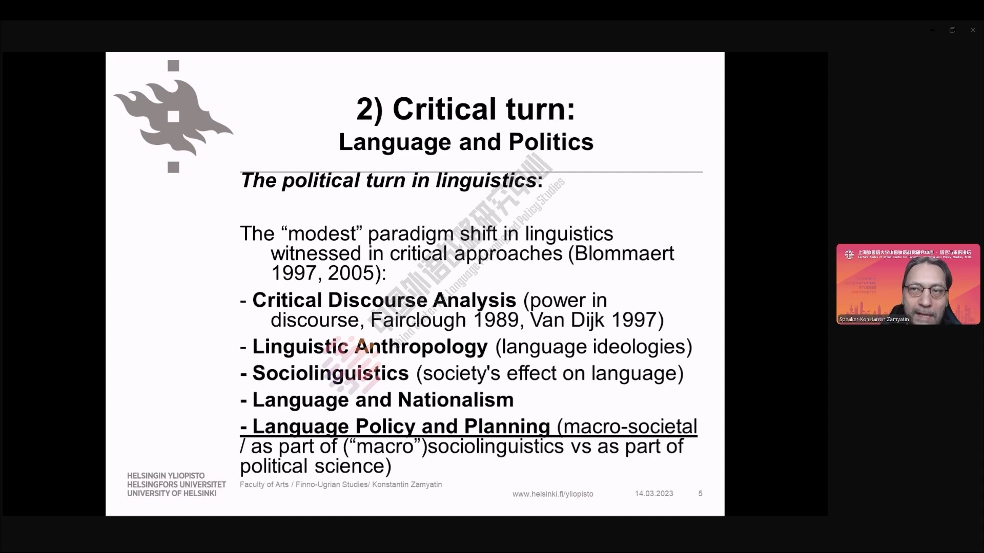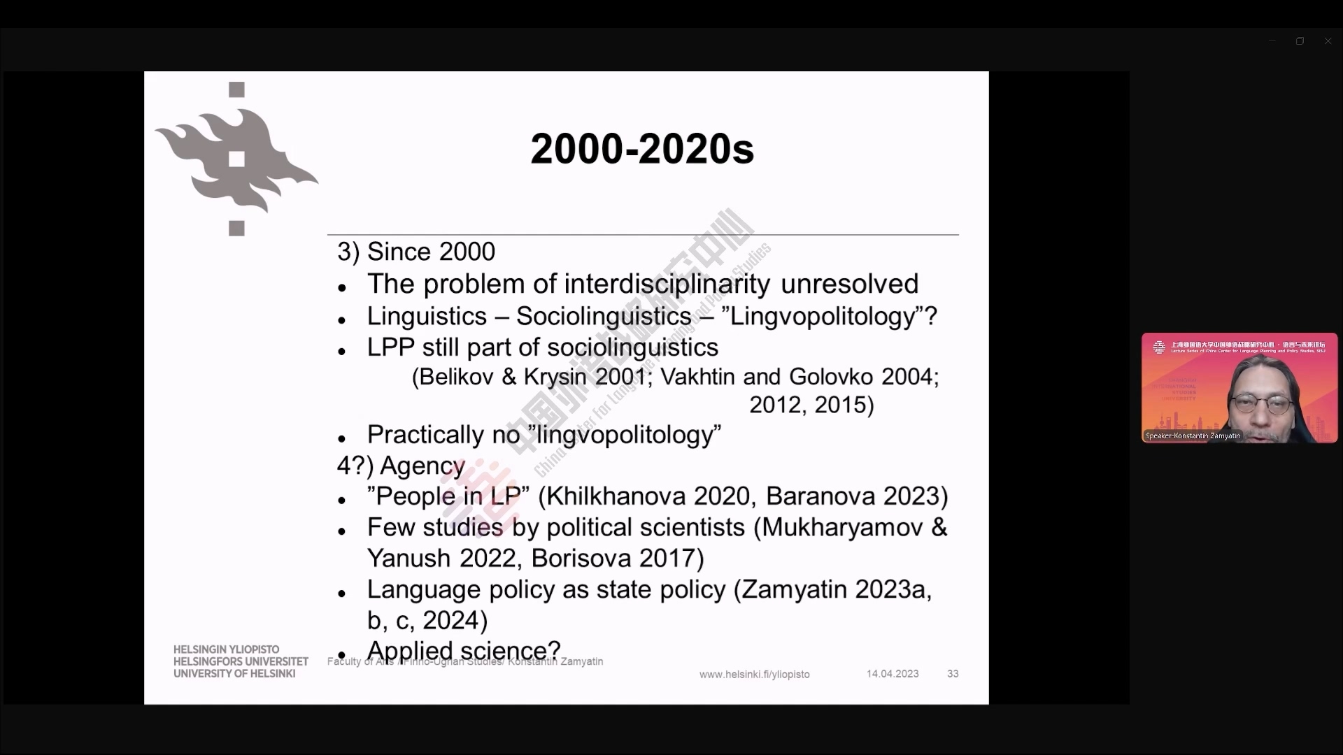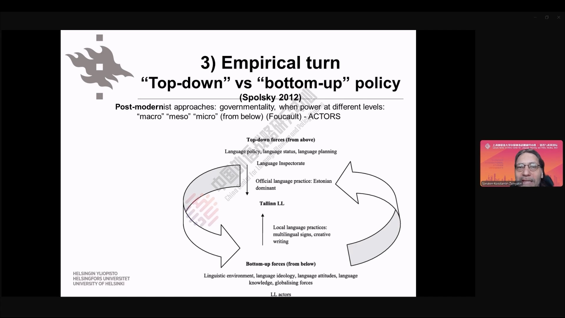讲座中,康斯坦丁·扎米亚京博士首先回顾了社会语言学和语言交叉学科的形成,然后从理论与实践两个方面,以语言政策与语言规划、语言濒危与语言复兴为主题展开讲座。语言政策与语言规划学科的发展有四个阶段,第一阶段是政府从上往下的语言政策;第二阶段是语言与政治研究的重要转折,包括政治研究的三个角度,公共政策的五个阶段,Spolsky的语言政策三个组成部分:语言意识、语言实践和语言管理,基于政策和基于权利的途径;第三阶段是实践转折,包括从上而下和从下而上语言政策研究的对比,语言规划研究的理论与实践;第四阶段是建构主义视角。他还介绍了社会语言学和公共政策视角的区别。然后扎米亚京博士讲述了俄罗斯政策与语言规划的历史发展和现状。