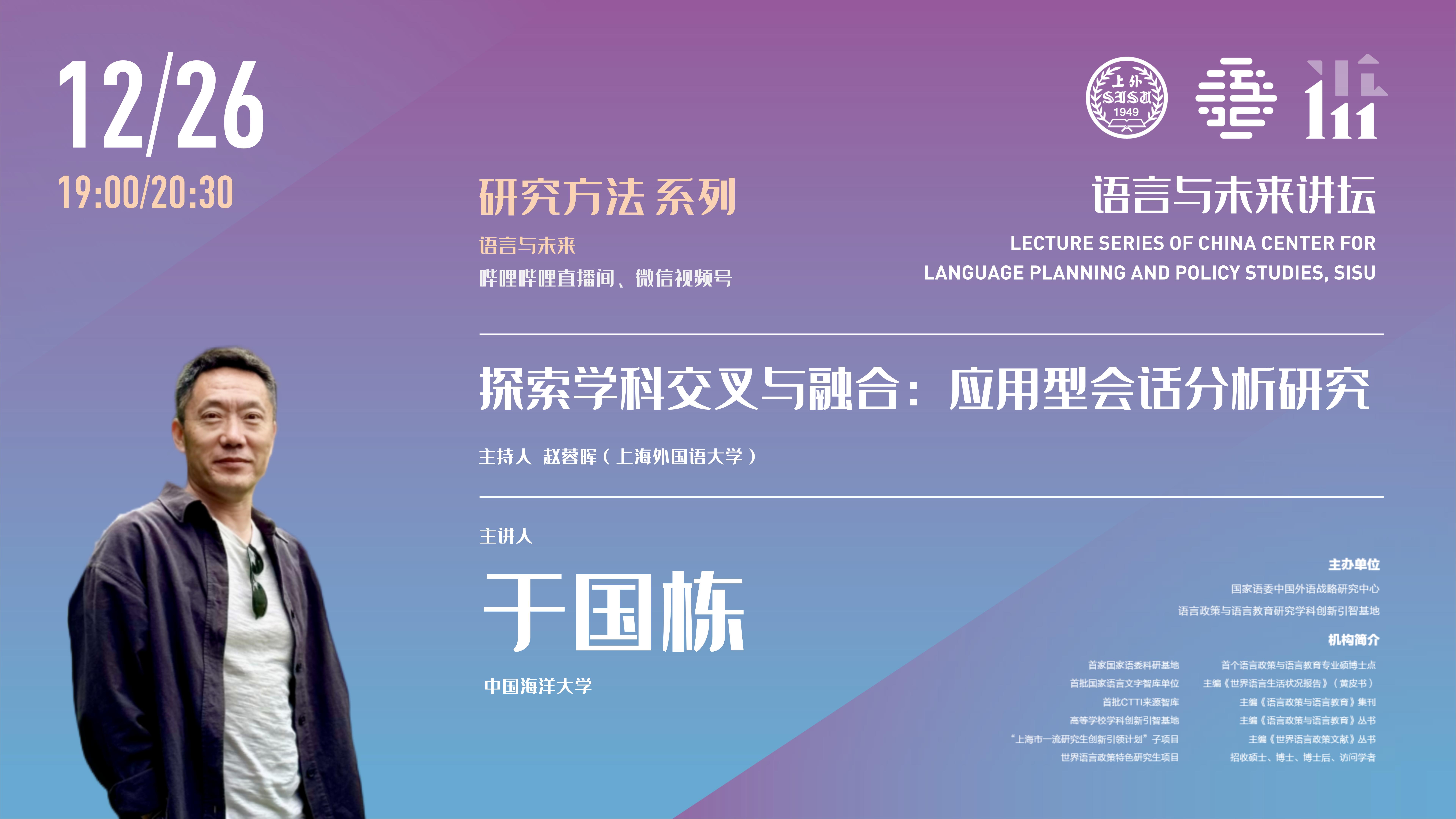 会话分析自出现以来就一直被来自不同语言文化的研究者用来探索社会成员开展社会生活的模式规律,随着会话分析研究的深入开展,研究发现也逐渐被不同学科接受和采用来开展学科交叉与融合的尝试与实践。而应用型会话分析研究就是开展学科交叉与融合的一个极具潜力的领域。本讲座首先简要介绍会话分析研究方法的典型特征与操作规范,然后展示应用会话分析研究的典型案例(包括医患互动、急救电话沟通、孤独症儿童互动等),以此说明应用型会话分析研究在学科交叉与融合中独有学术价值与应用价值。