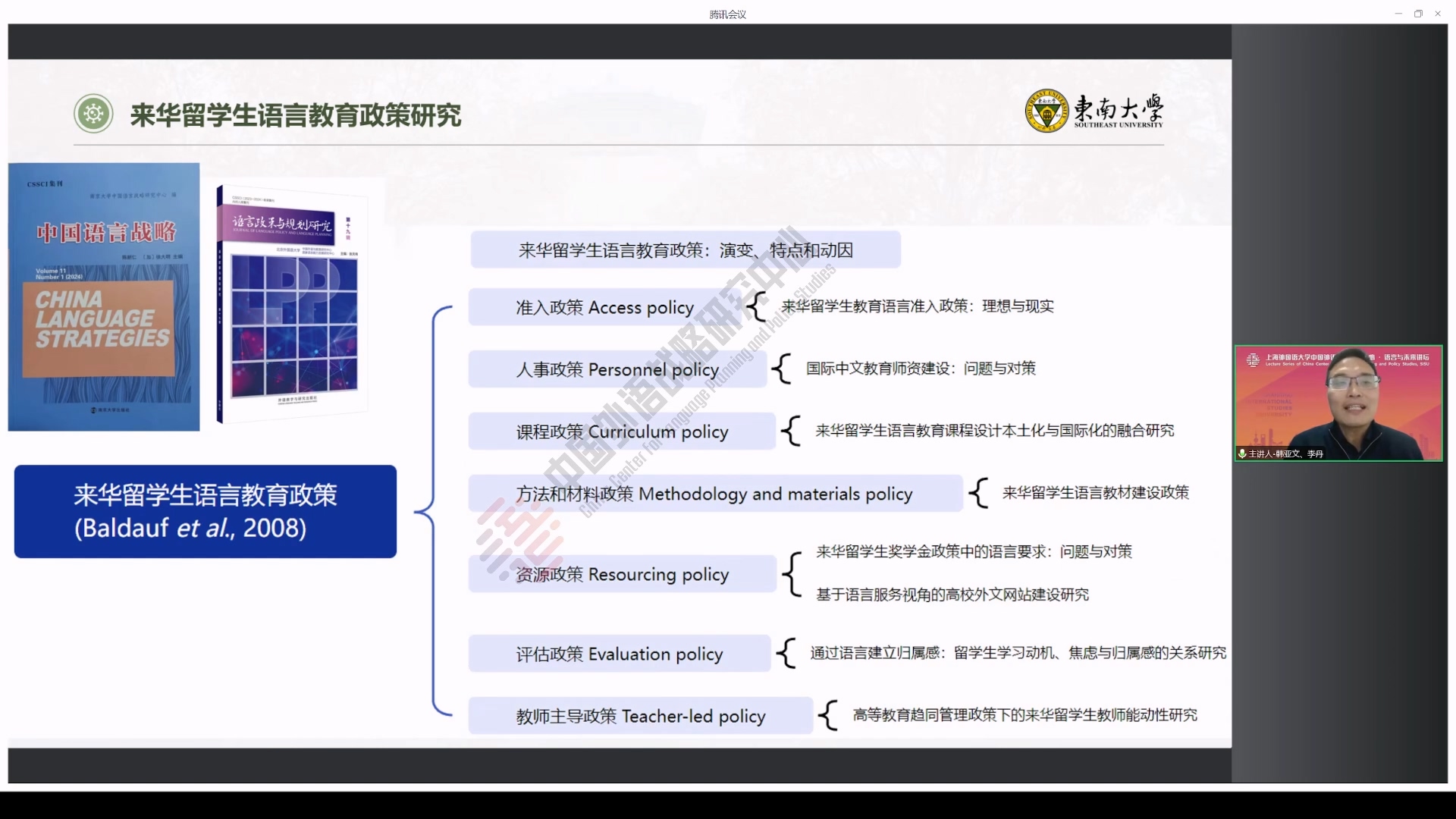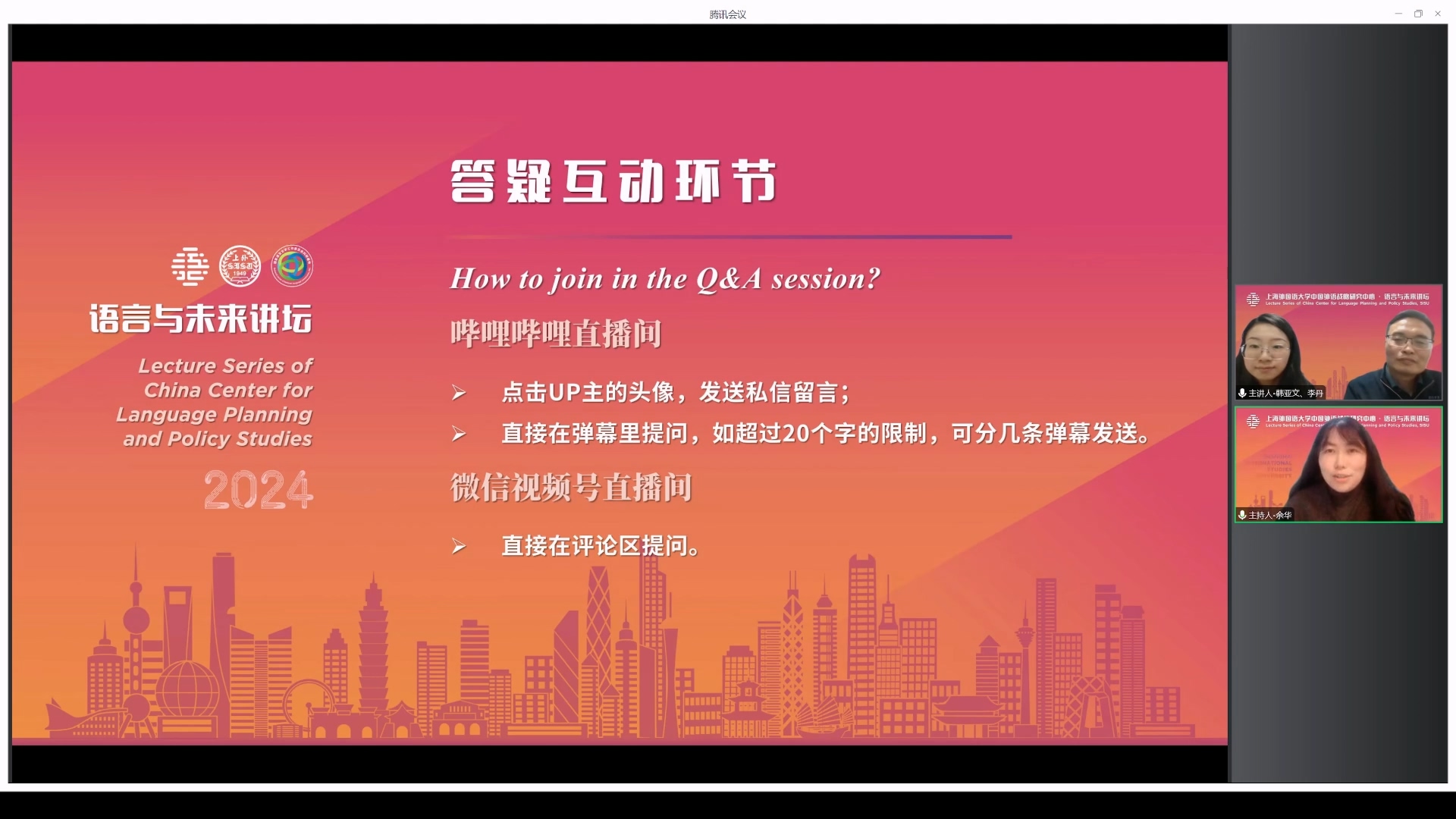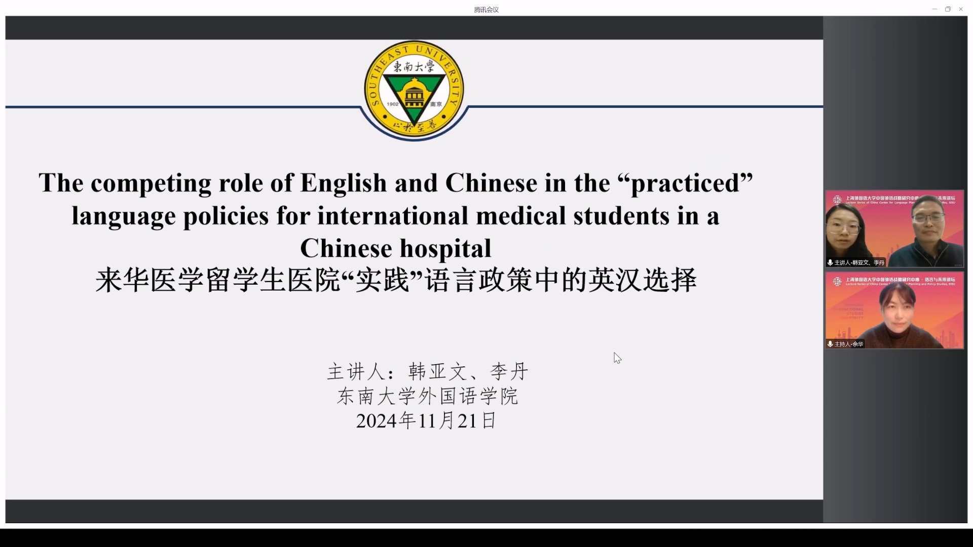 2024年11月21日,东南大学韩亚文教授和博士研究生李丹做客中国外语战略研究中心“语言与未来讲坛”,做了题为《来华医学留学生医院“实践”语言政策中的英汉选择》的学术讲座。本次讲座由上海外国语大学中国外语战略研究中心副主任余华副研究员主持,超过400位师生线上参加了本次讲座。
