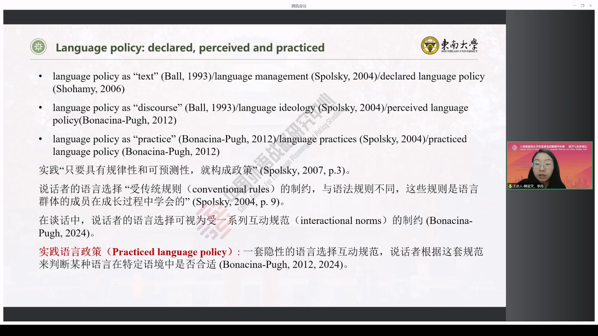 讲座伊始,韩亚文教授对来华留学生语言教育政策研究进行了初步概述,并从理论和实践两个维度进一步梳理了来华留学生EMI教育的相关研究。随后,韩教授和李丹博士生共同阐述了来华医学留学生EMI教育的研究背景。李丹博士生详细介绍了“实践”语言政策的概念,并以她进行了两年的民族志研究为例,展示了数据收集与分析方法,分享了她的研究发现:医院内实行的“实践”语言政策并不是预先确定的,而是受到一系列外部因素的制约;“实践”语言政策根植于各种权力关系交织的空间;中英文之间、全球与本地之间的紧张关系导致了医院内部不同语境下的规则相互竞争。最后,韩教授针对政策制定者、带教老师、学校与医院、其他医护人员和留学生五大群体分别给出了相关建议。
