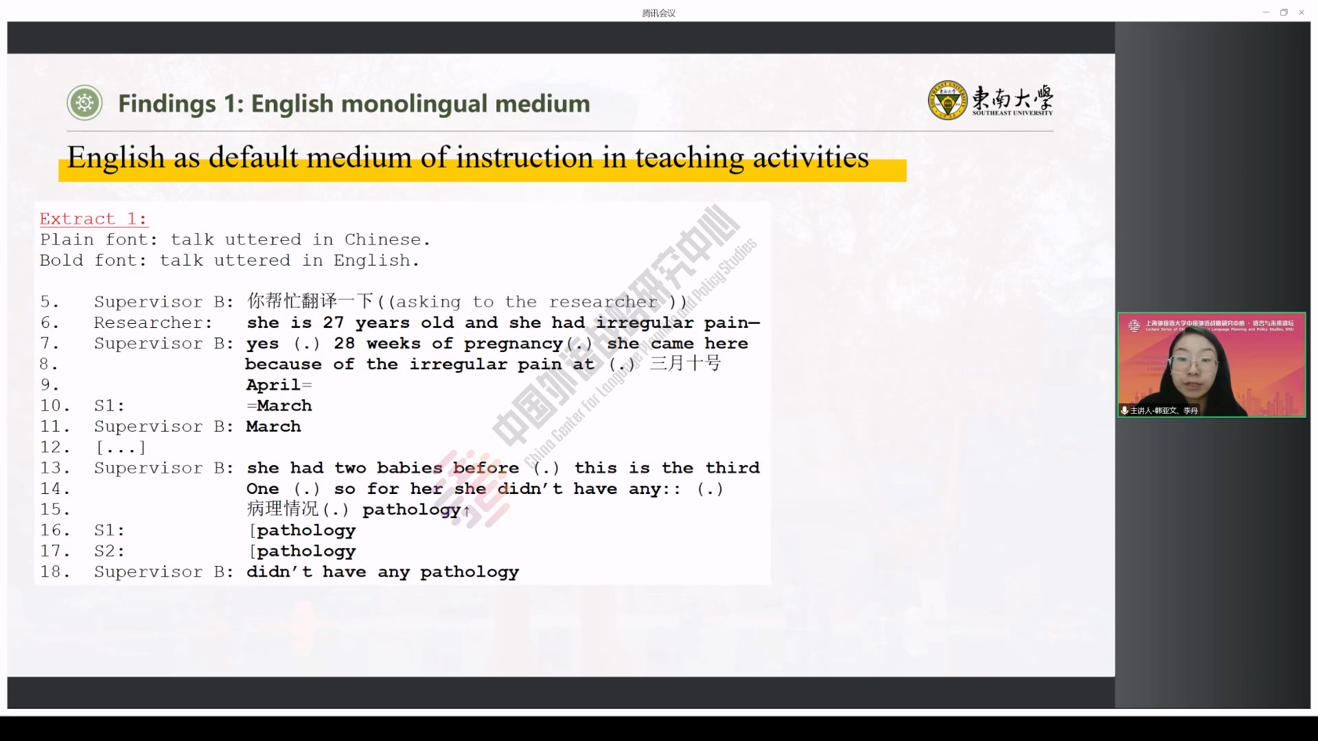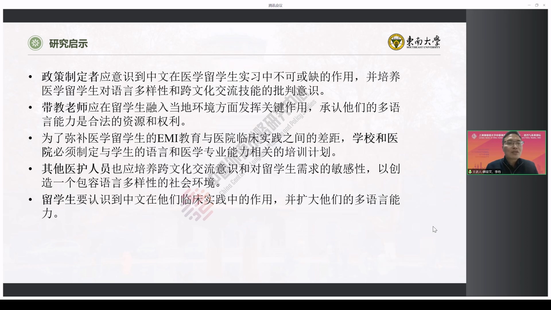 韩亚文和李丹于中国外语战略研究中心“语言与未来讲坛”谈来华医学留学生医院“实践”语言政策中的英汉选择