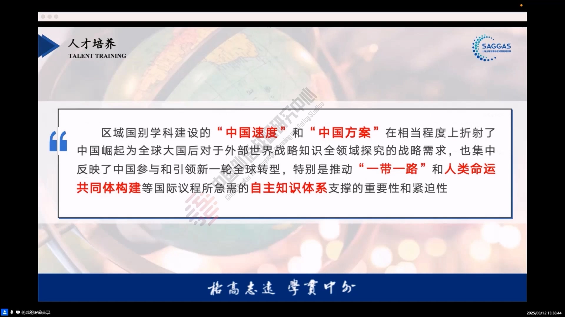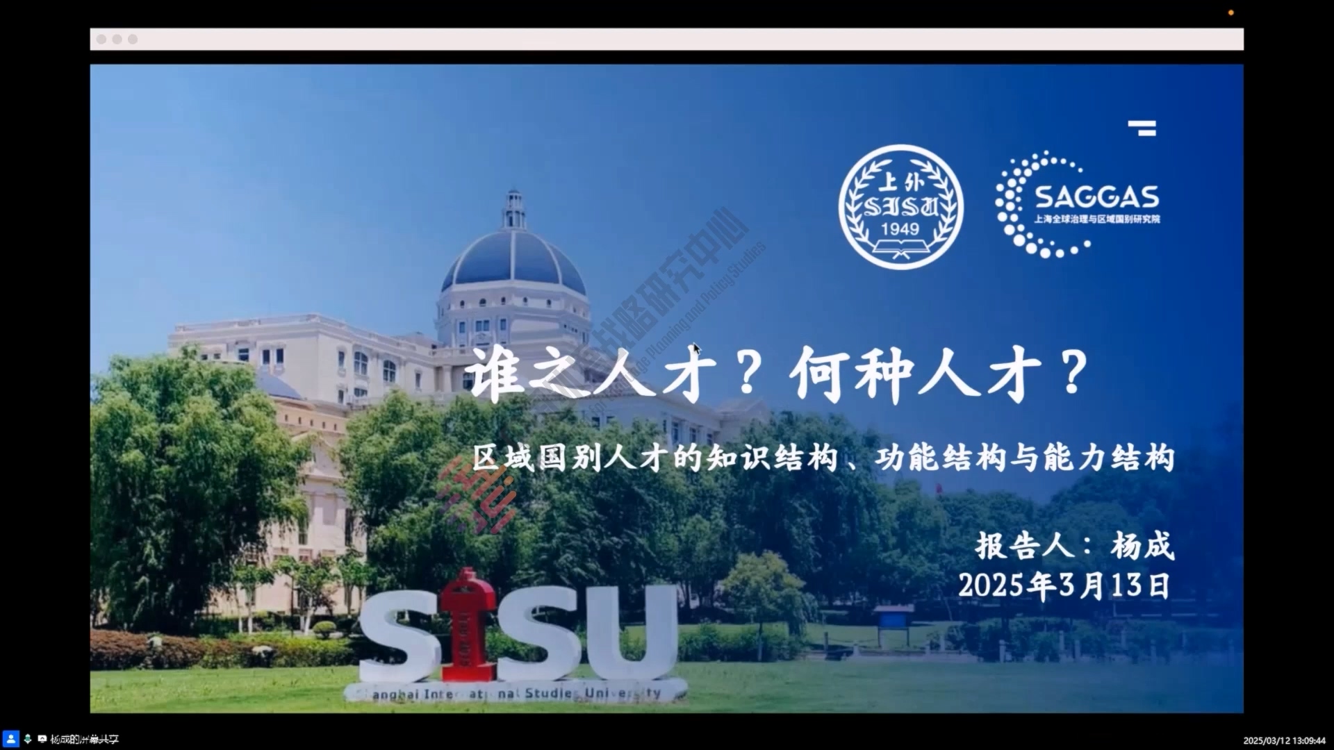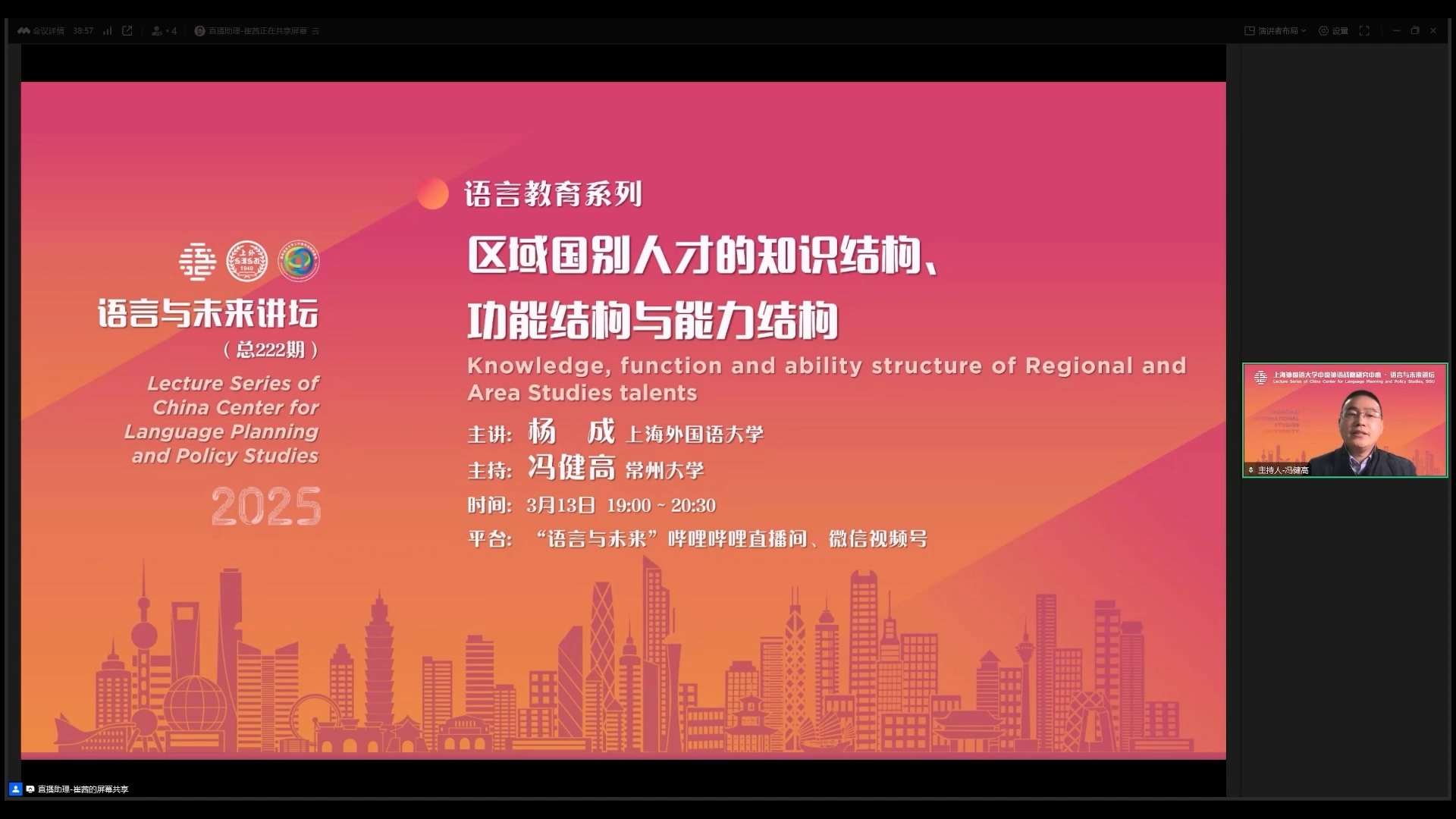 2025年3月13日,上海外国语大学杨成教授做客“语言与未来”讲坛,发表了题为《区域国别人才的知识结构、功能结构与能力结构》的学术报告。本次讲座由常州大学冯健高副教授主持,1300余位观众在线参加了本次讲座