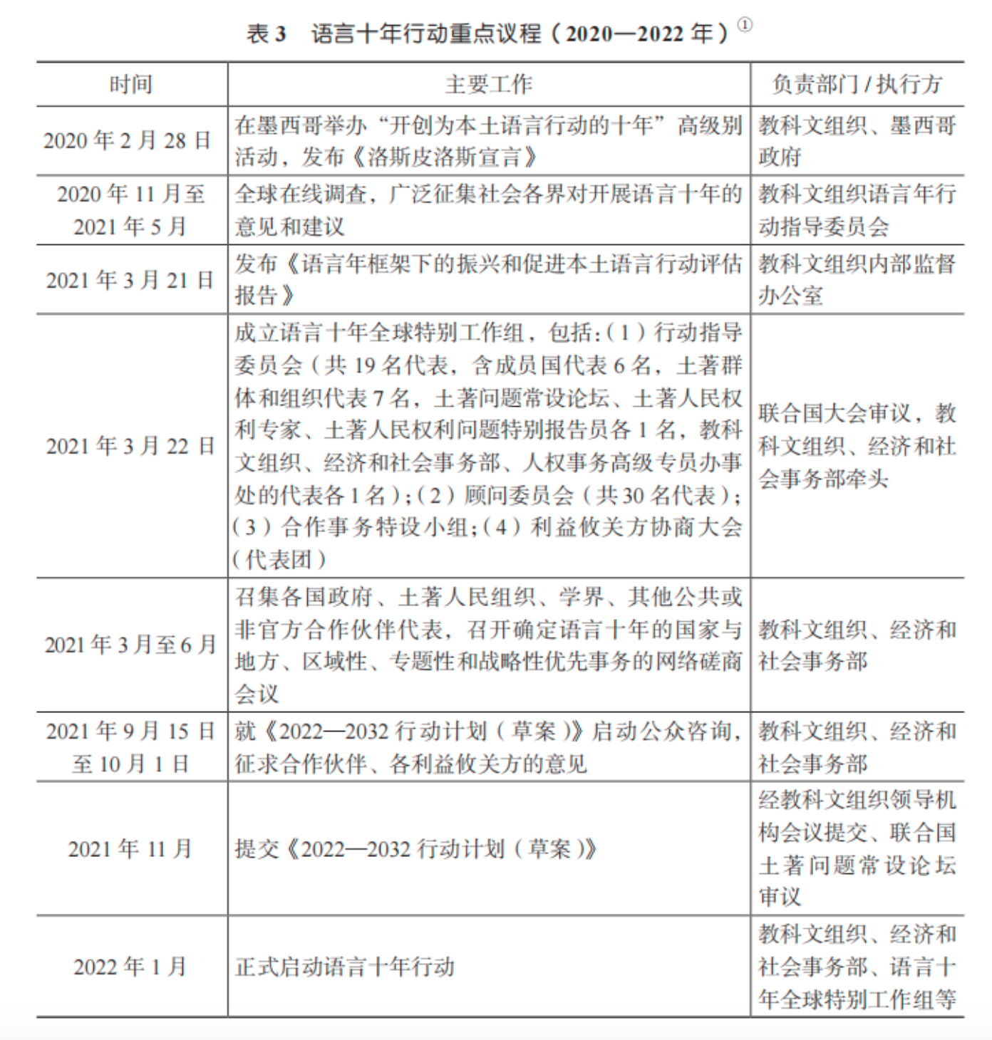 2021 年 3 月,教科文组织发布《2019 语言年旗舰报告:动员国际社会保护、振兴和促进本土语言》,成立本土语言十年(本文简称“语言十年”)部际协作组,为活动筹划、实施和监测提供指导,形成保护语言多样性的国际治理机制。是月,语言十年全球特别工作组成立事宜通过联合国大会审议,成员每三年一换届并举行协商大会,就技术支持、区域事务及专项领域等核心议题开展战略对话论坛。从长远看,语言十年行动将对反思语言多样性理念的国际传播与实践效果起到引领作用。