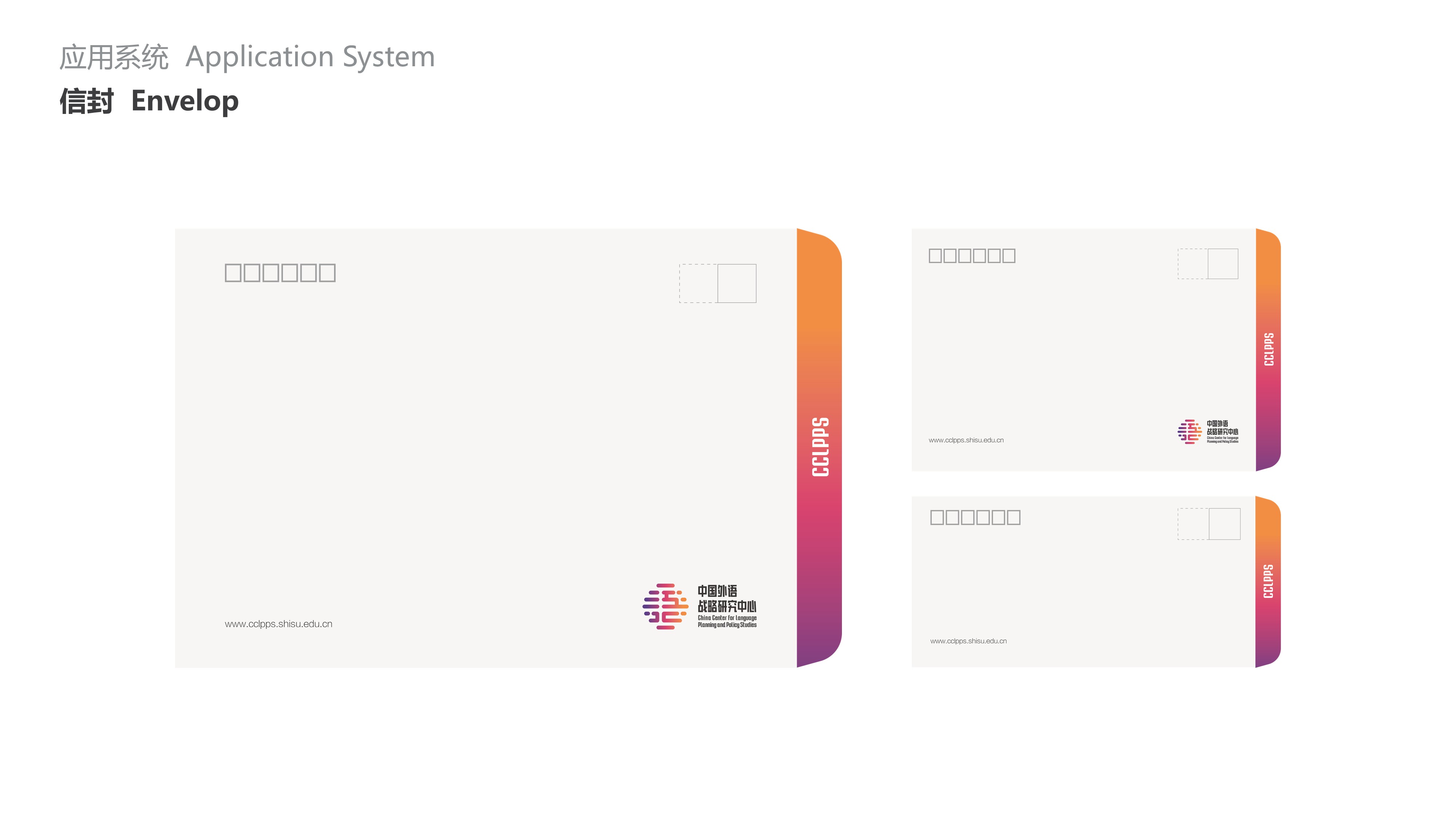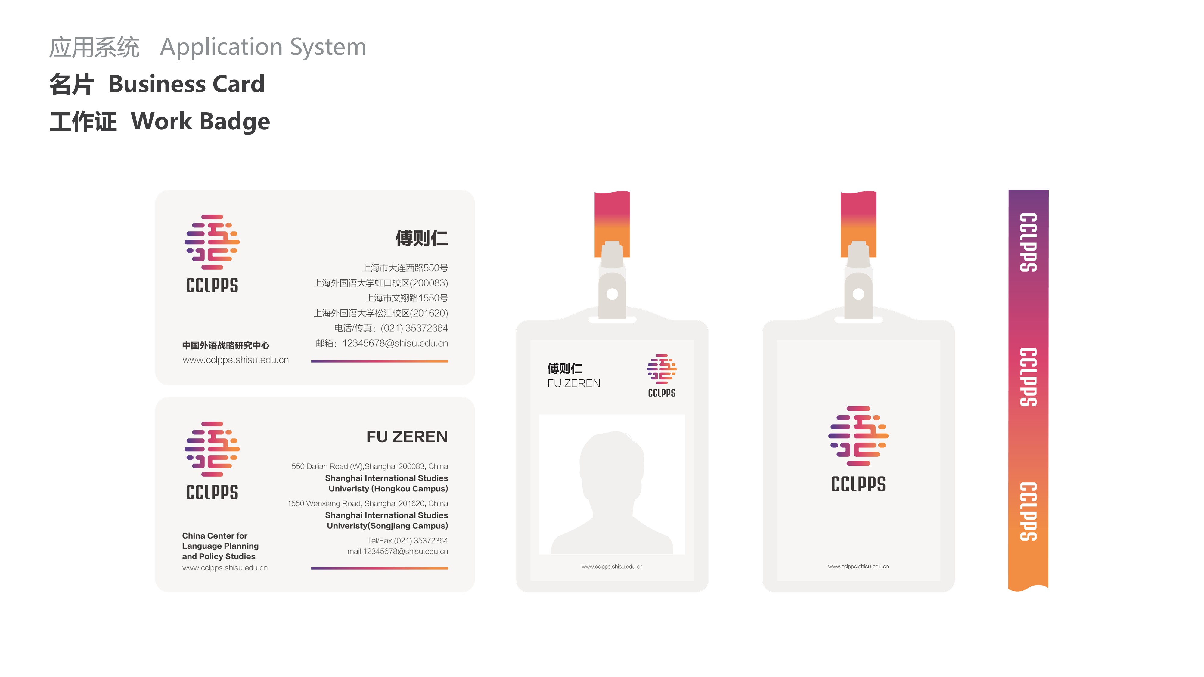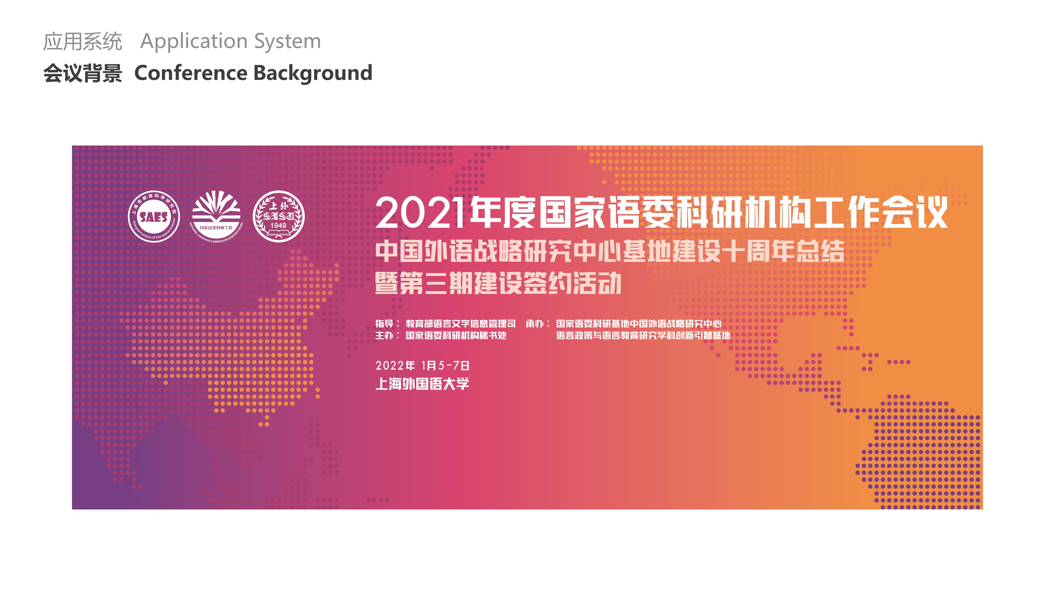 中国外语战略研究中心的视觉标识系统,分为基础系统和应用系统两个部分。基础系统包括中心标识、标准色彩、标准字体以及辅助图形等基础元素;应用系统包括信封、信纸、名片、手提袋、工作证、PPT模板、会议背景等多个应用场景中的标识。