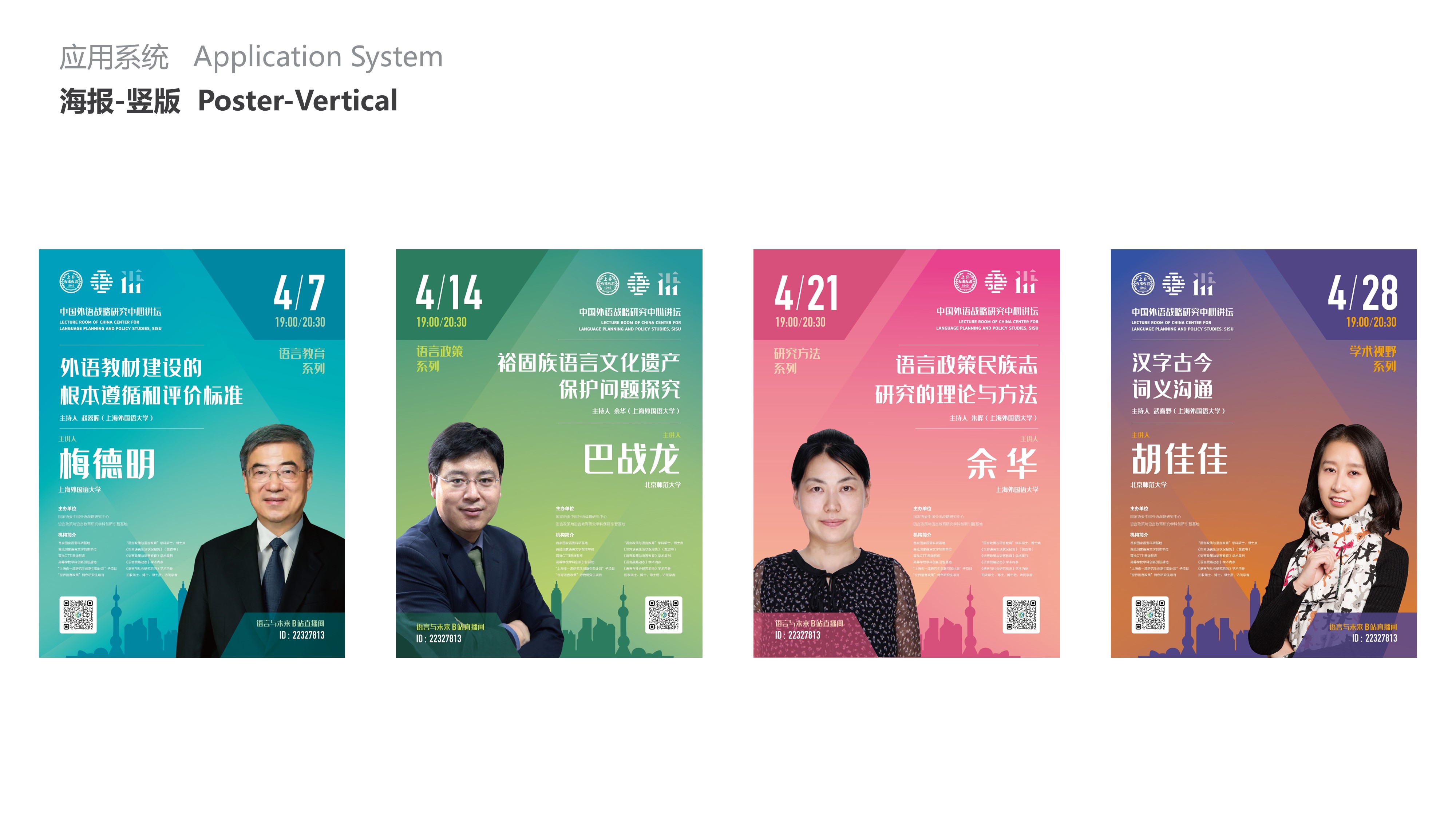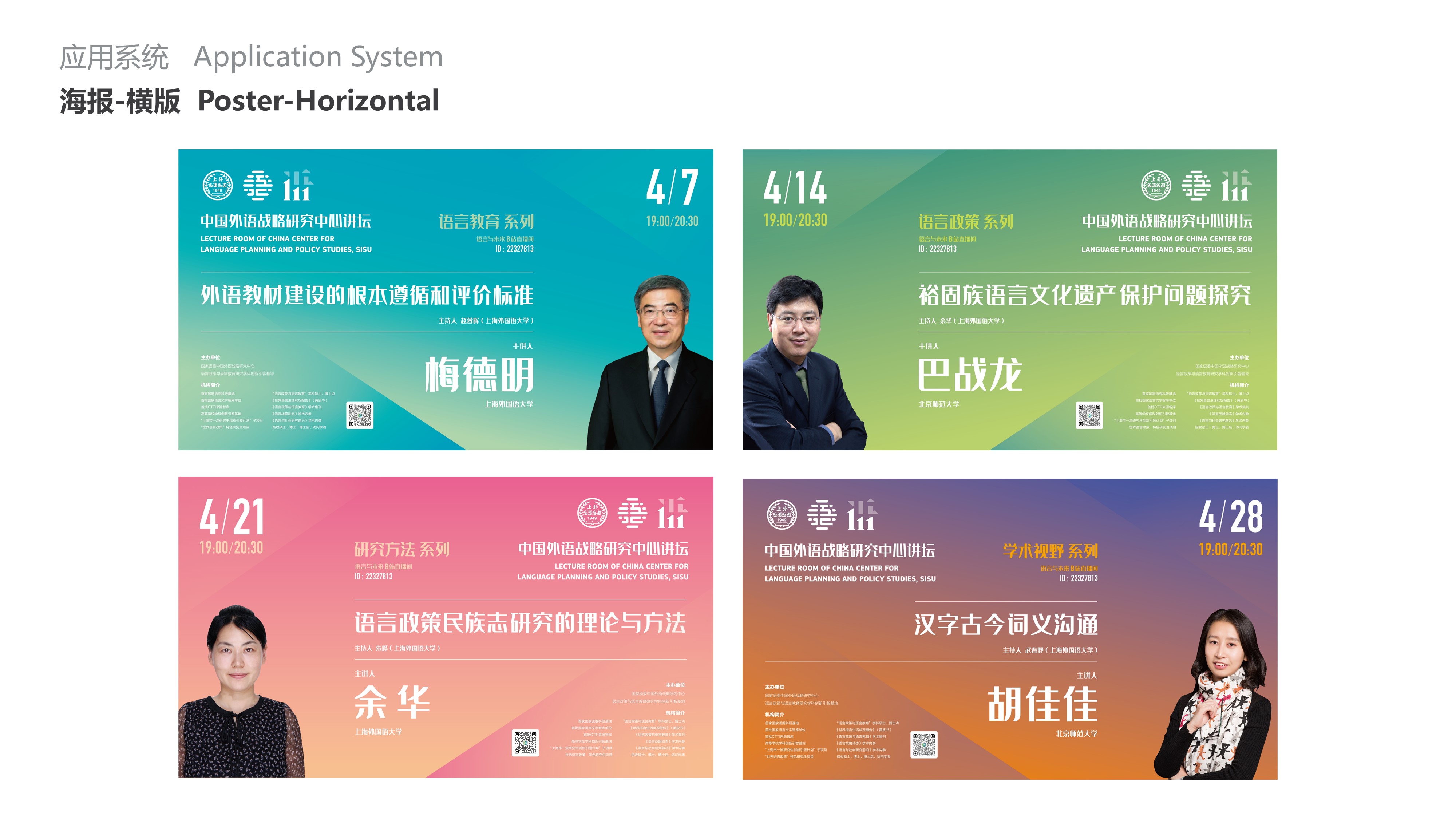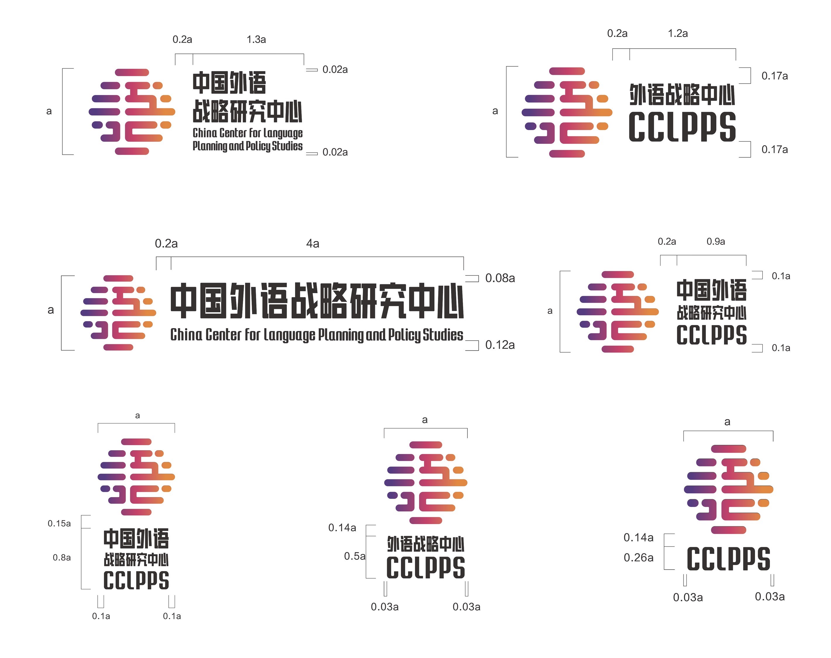 中国外语战略研究中心的视觉标识系统,分为基础系统和应用系统两个部分。基础系统包括中心标识、标准色彩、标准字体以及辅助图形等基础元素;应用系统包括信封、信纸、名片、手提袋、工作证、PPT模板、会议背景等多个应用场景中的标识。