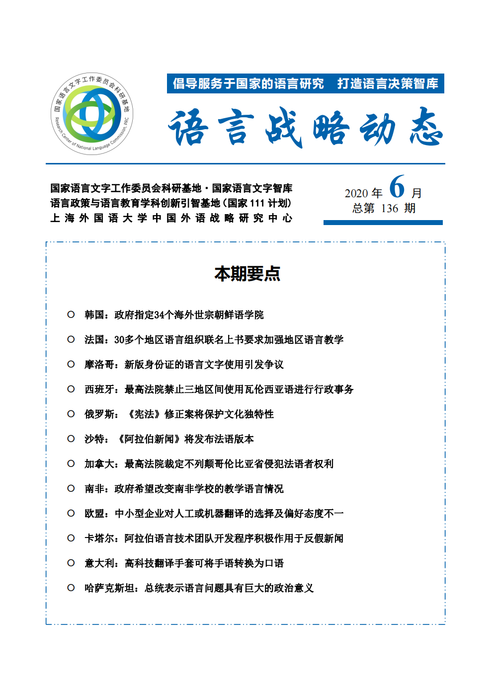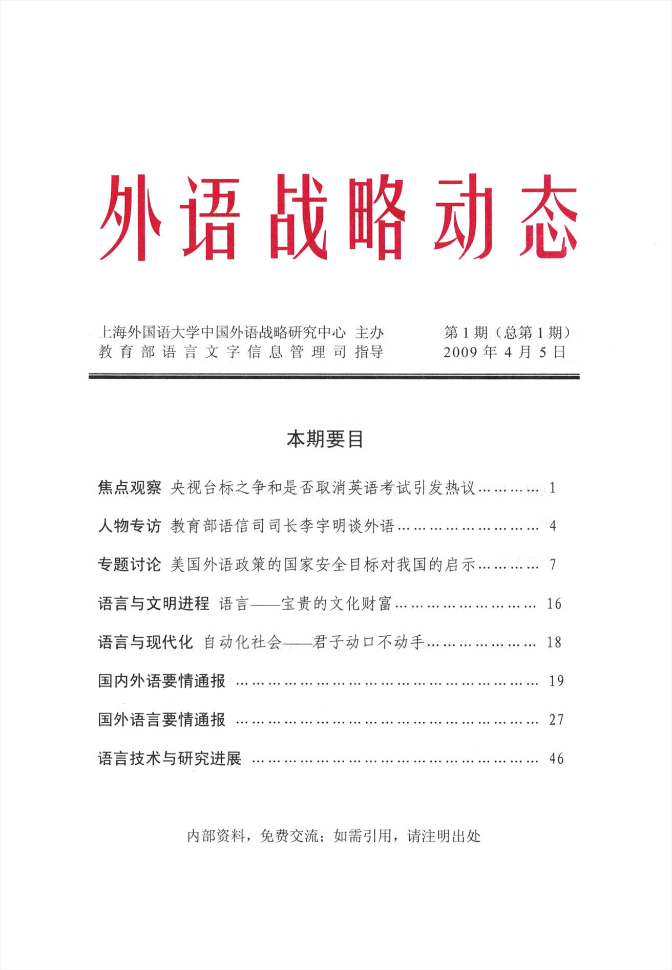 2009年创办的内参刊物《语言战略动态》(曾用名《外语战略动态》),是了解世界语言生活前沿动态的窗口。该刊是经上海市新闻出版局批准的连续性内部出版物(准印证:K第0620号),创刊至今已编辑148期。刊物常设学界动态、语言政策、语言政治、语言传播、语言教育、语言技术、语言规范、语言服务、海外华文、语言保护等10个栏目,资讯均来自中心自主研发建设的“语言生活国际媒体监测数据库”,信息源覆盖28种语言的权威媒体,由上外的多语种工作团队负责翻译、整理。
