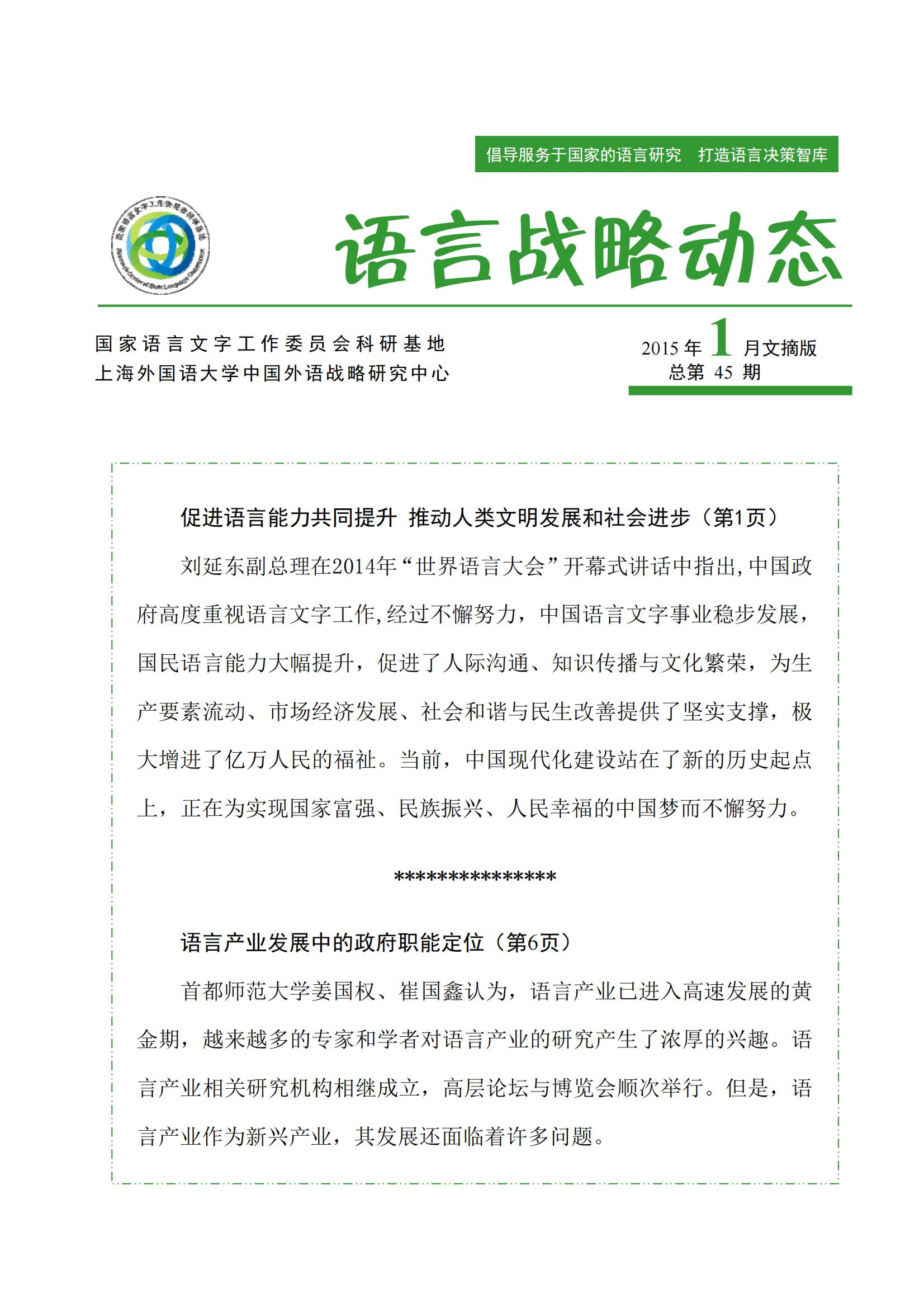 2014年1月,《动态》进行了较大改版,刊物名称改为《语言战略动态》,每月编辑2期⸺上半月推出学术文摘版(绿版),刊登重要的研究文章、政论文章、(海外)重要语言政策文件;下半月推出新闻版(蓝版),刊登国内外涉及语言生活重要动向的新闻资讯,按照主题分为语言政策、语言教育、语言科技、海外华语等栏目,形成学术和社会动态并重的格局。赵蓉晖任主编,沈骑任副主编(2014-2015),郭家堂任编务(2016年起任常务副主编)。 |