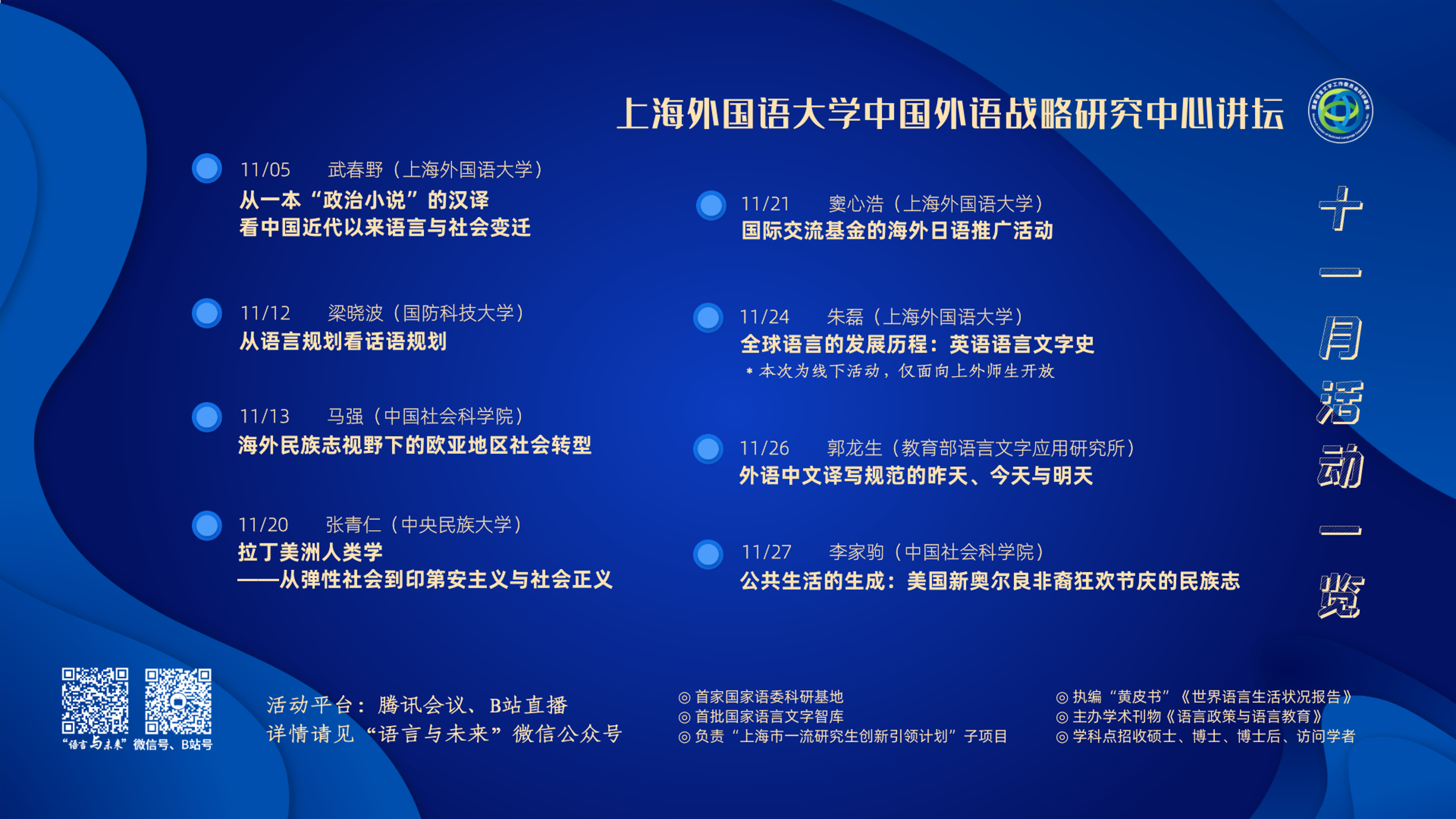 讲坛不仅邀请海内外知名专家进行专题讲座,亦为青年学者创造分享研究心得的机会。2011年以来已举办的活动超过500场,受益的海内外听众超过30万人次,在语言与社会研究这一领域具有广泛的学术影响力。