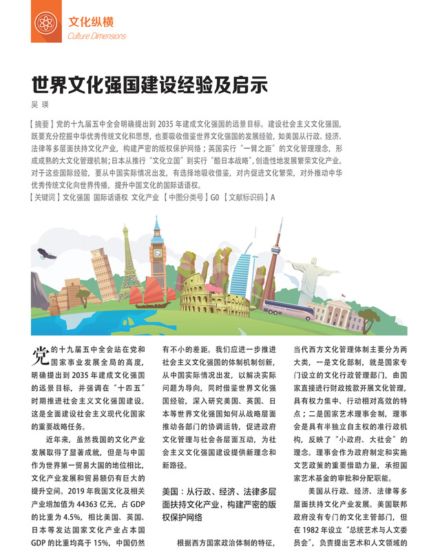 【摘 要】党的十九届五中全会明确提出到2035年建成文化强国的远景目标。建设社会主义文化强国,既要充分挖掘中华优秀传统文化和思想,也要吸收借鉴世界文化强国的发展经验,如美国从行政、经济、法律等多层面扶持文化产业,构建严密的版权保护网络;英国实行一臂之距的文化管理理念,形成成熟的大文化管理机制;日本从推行文化立国到实行酷日本战略,创造性地发展繁荣文化产业。对于这些国际经验,要从中国实际情况出发,有选择地吸收借鉴,对内促进文化繁荣,对外推动中华优秀传统文化向世界传播,提升中国文化的国际话语权。