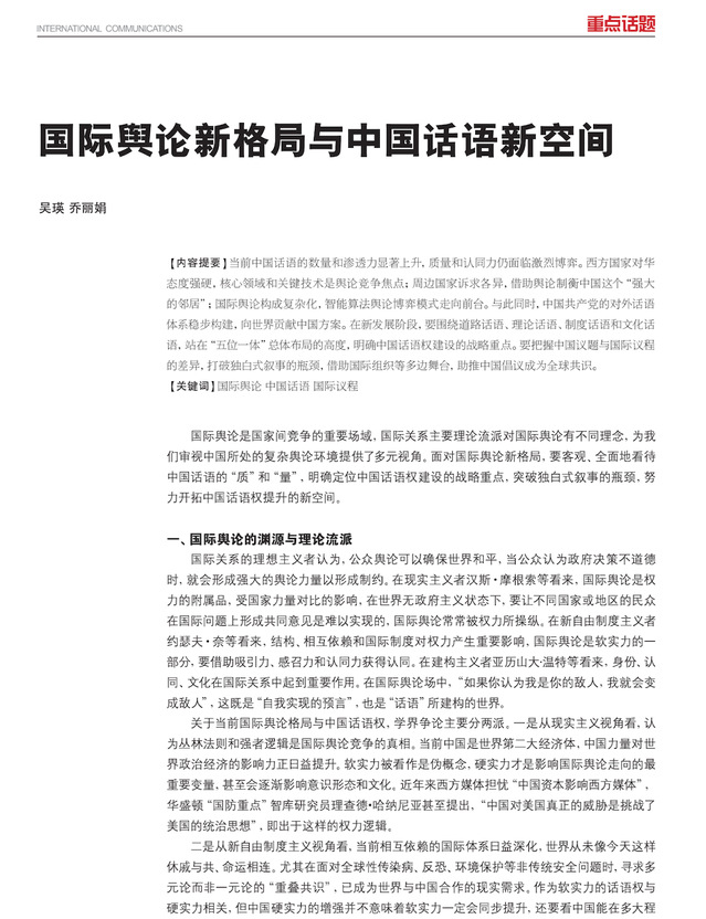 【摘 要】当前中国话语的数量和渗透力显著上升,质量和认同力仍面临激烈博弈。西方国家对华态度强硬,核心领域和关键技术是舆论竞争焦点;周边国家诉求各异,借助舆论制衡中国这个强大的邻居;国际舆论构成复杂化,智能算法舆论博弈模式走向前台。与此同时,中国共产党的对外话语体系稳步构建,向世界贡献中国方案。在新发展阶段,要围绕道路话语、理论话语、制度话语和文化话语,站在五位一体总体布局的高度,明确中国话语权建设的战略重点。要把握中国议题与国际议程的差异,打破独白式叙事的瓶颈,借助国际组织等多边舞台,助推中国倡议成为全球共识。