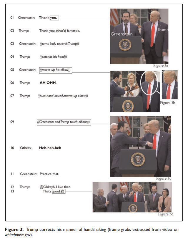 戈夫曼认为,人们正是用无声的身体符号进行社会交往。霍尔《无声的语言》里也有类似的观点。感兴趣的小伙伴儿们,可以读一读他俩的书。这项研究的数据来研究者在加州洛杉矶COVID-19暴发期间进行的自我民族志观察,以及美国、荷兰和德国等几个不同国家政治会议有关的公开网络视频资源。