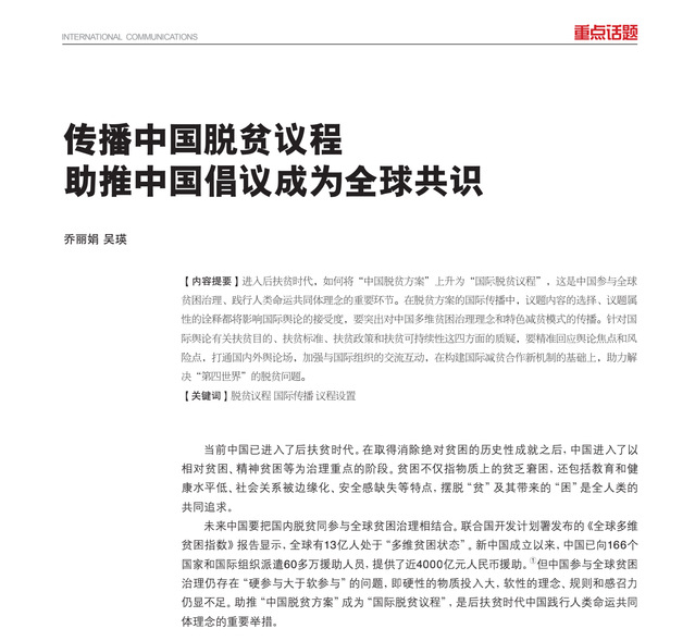 【摘 要】进入后扶贫时代,如何将中国脱贫方案上升为国际脱贫议程,这是中国参与全球贫困治理、践行人类命运共同体理念的重要环节。在脱贫方案的国际传播中,议题内容的选择、议题属性的诠释都将影响国际舆论的接受度,要突出对中国多维贫困治理理念和特色减贫模式的传播。针对国际舆论有关扶贫目的、扶贫标准、扶贫政策和扶贫可持续性这四方面的质疑,要精准回应舆论焦点和风险点,打通国内外舆论场,加强与国际组织的交流互动,在构建国际减贫合作新机制的基础上,助力解决第四世界的脱贫问题。