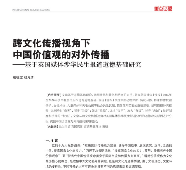 【摘 要】文章基于道德基础理论,运用质化与量化相结合的方法,研究英国媒体《镜报》2016年至2020年涉华社会民生报道的道德基础。发现《镜报》关注中国动物保护、传统习俗、特殊群体权益保护、女性地位、儿童保护和灾难救援等社会民生议题,整体使用负面的道德基础,呈现道德冲突框架:突出民生“伤害”,而非“关爱”;强调“欺骗”,诉求“公平”;放大“背叛”,背弃“忠诚”;批评制度和法律的“权威”。文章从跨文化传播视角对英国媒体涉华民生报道背后的道德冲突原因进行分析,提出中国价值观对外传播的策略建议。