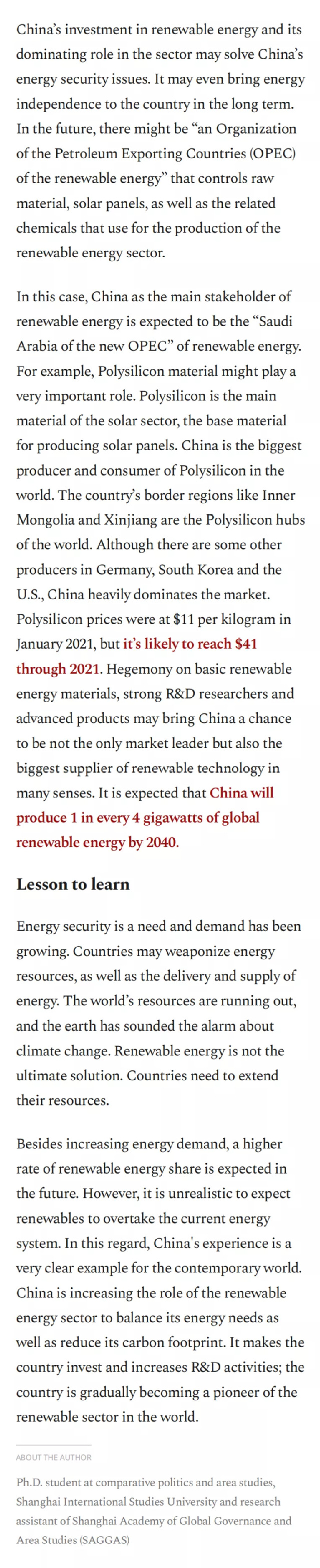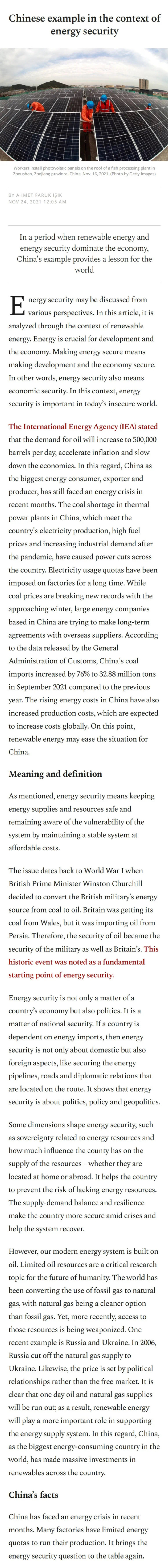 2021年11月24日,上海全球治理与区域国别研究院科研助理、上海外国语大学比较与区域国别研究专业博士候选人法陆克(Ahmet Faruk ISIK)在土耳其最大的英文报纸报纸Daily Sabah(《沙巴日报》)发表第四篇评论文章“Chinese example in the context of energy security”,介绍中国在可再生能源领域的发展经验。