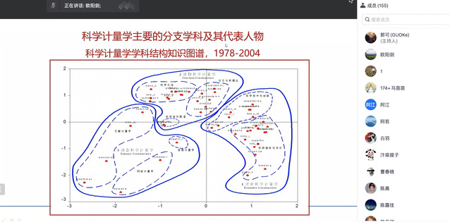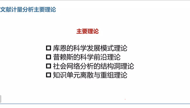 此外,欧阳剑老师从1934年开始对文献计量分析的学科发展进行梳理,并对文献计量分析中库恩的科学发展模式理论、普赖斯的科学前沿理论、社会网络分析的结构洞理论与知识单元离散与重组理论四大理论进行详细解读。