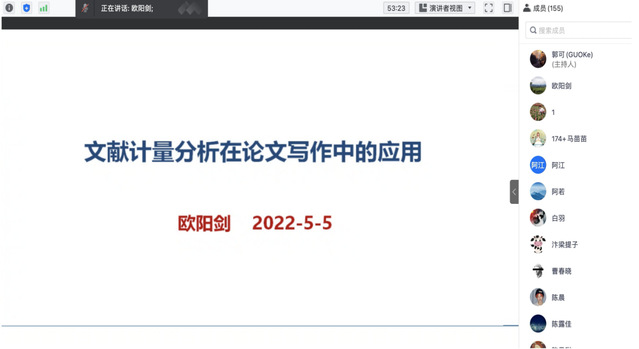5月5日下午,上海外国语大学新闻传播学学院举办主题为“文献计量分析在论文写作中的应用”的讲座,该讲座由上海外国语大学图书馆研究馆员、中国国际奥情研究中心研究员欧阳剑主讲,新闻传播学院院长郭可主持,新闻传播学院教师吴秀娟等受邀出席了此次讲座,上海外国语大学、暨南大学、南开大学等近两百名高校学子参与本次讲座及线上讨论环节。