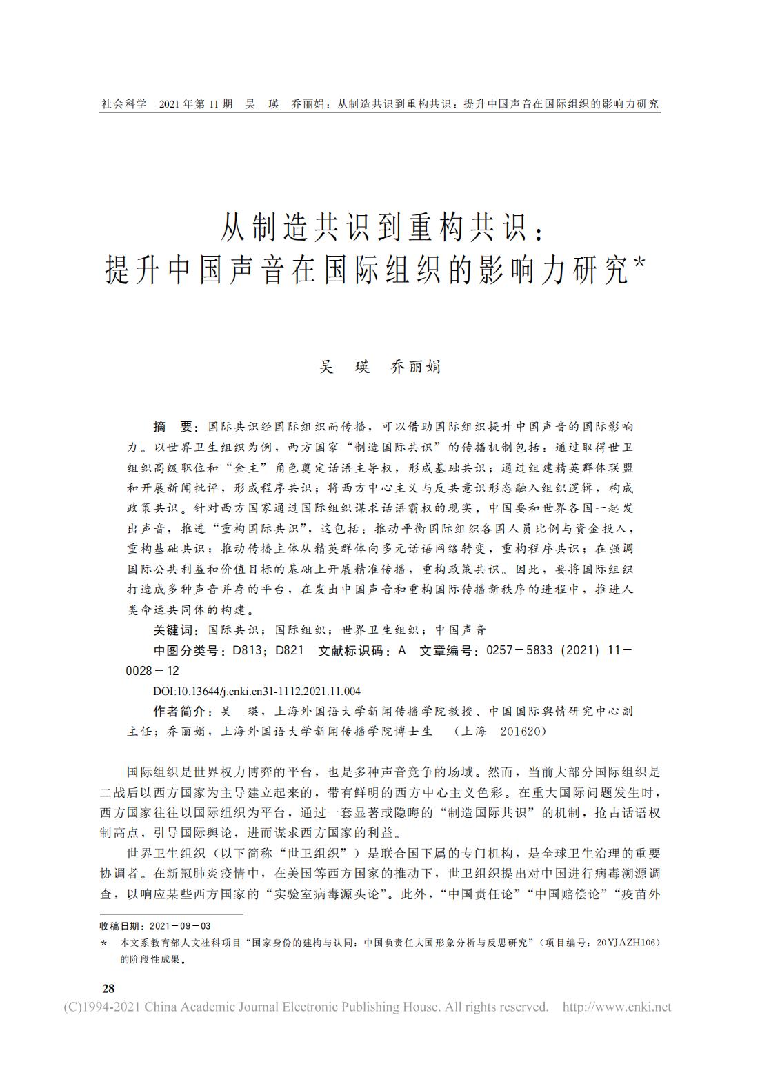 吴瑛:从制造共识到重构共识 : 提升中国声音在国际组织的影响力研究《社会科学》