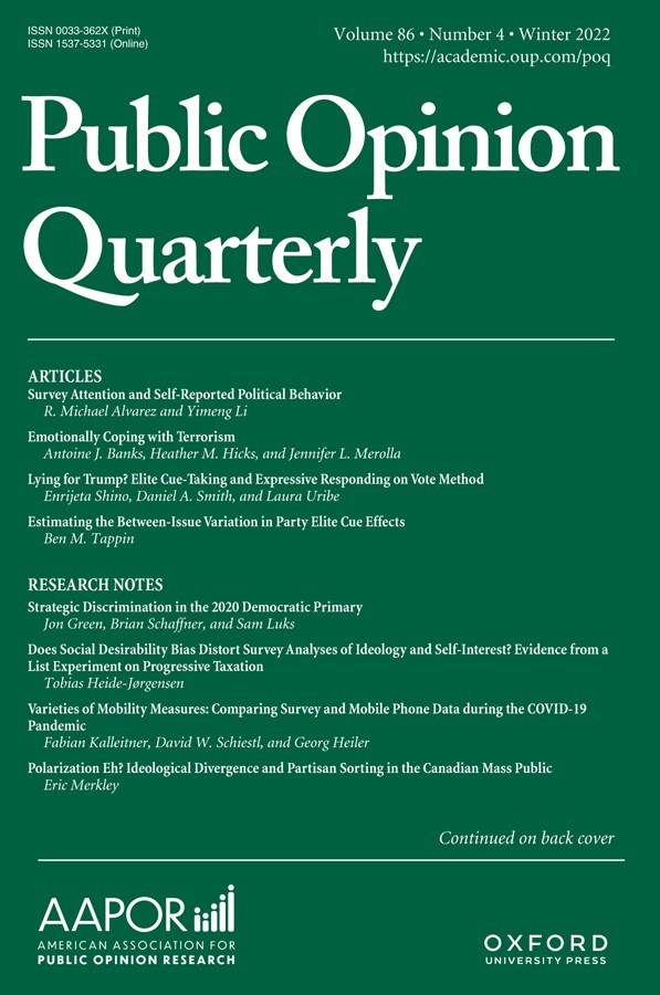精英提示信息是否会影响人们的投票方式?既有文献侧重于精英提示信息对候选人评价或政策偏好的影响,但人们对精英提示信息如何影响投票方式偏好知之甚少。基于一项针对佛罗里达州有效选民的大型调查(包括经常通过邮件投票的选民),研究发现,在2020年大选之前,回顾性和前瞻性投票方式误报主要由对特朗普的支持驱动。政治意识强的特朗普支持者更有可能否认自己通过邮件投票,并误报其在11月选举中的预期投票方式。了解精英提示信息对自我报告的政治行为政治化的影响和限制,对民调人员和竞选活动、选举管理者、选民及更广泛的民主选举进程来说具有重要意义。