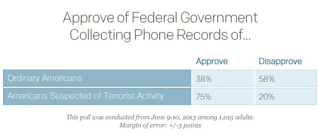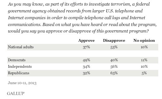 即便如此,盖洛普民调结果显示53%的美国反对而37%的人支持联邦政府以反恐之名来获取美国人电话和上网记录。与06年盖洛普的调查结果相比较,这一次的调查结果与之前相吻合的。在2006年,盖洛普问民众“是否同意美国政府从美国三大电话公司获取通话记录来建立一个数据库时”51%的民众表示反对,43%的人表示支持。