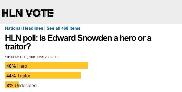 CNN的在线民意调查结果也显示其中48%的人认为斯诺登是英雄,44%的人认为斯诺登是叛徒,而8%的人不确定。
