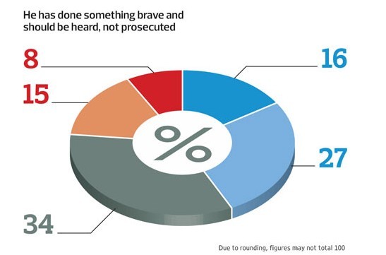 《卫报》的在线民调结果显示43%的人认为斯诺登做了一些“非常勇敢并且应该被公众所知道的事情,他不应该被指控”而大约五分之一(23%)的人不同意这个观点。