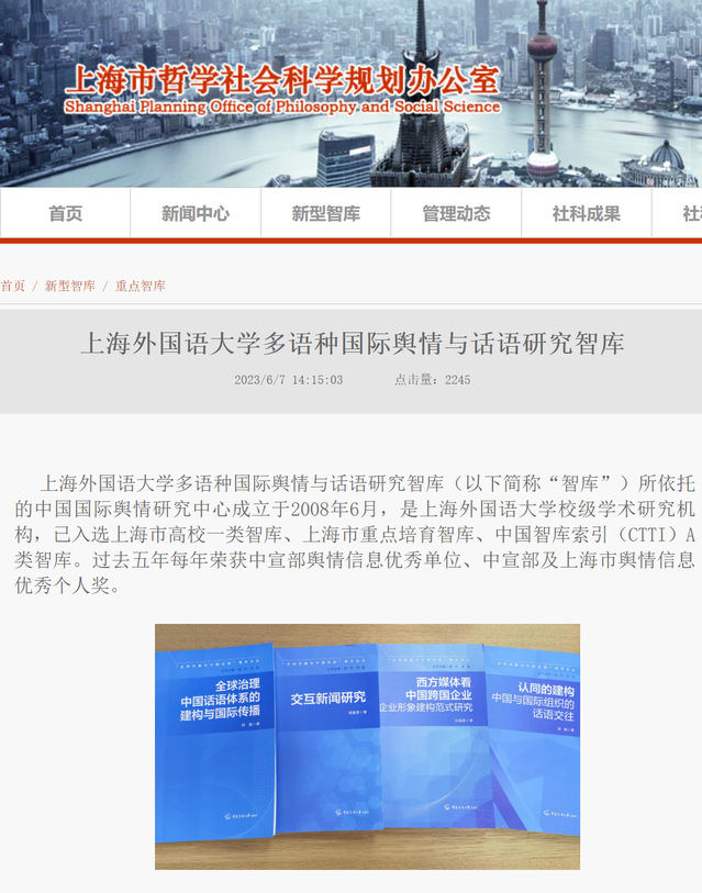 上海外国语大学多语种国际舆情与话语研究智库作为上海市重点培育智库,最近受到上海市哲学社会科学规划办公室网站推介。