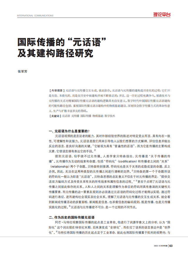 【摘 要】元话语与元传播交互生成,彼此依存。元话语与元传播的建构是历史化的过程:它们不是先验、本质化的,而是在历史中被建构并被不断修正的;并且,这一历史过程充满争斗。厘清技术与元传播的关系对理解国际传播元话语的建构逻辑具有启发意义。数字时代中国国际传播元话语建构的可能性路径包括:重视国际传播元语言建构中的物质基础建设,深刻领会数字传播方式的革命性意义,生产与扩散丰富多元的符码。