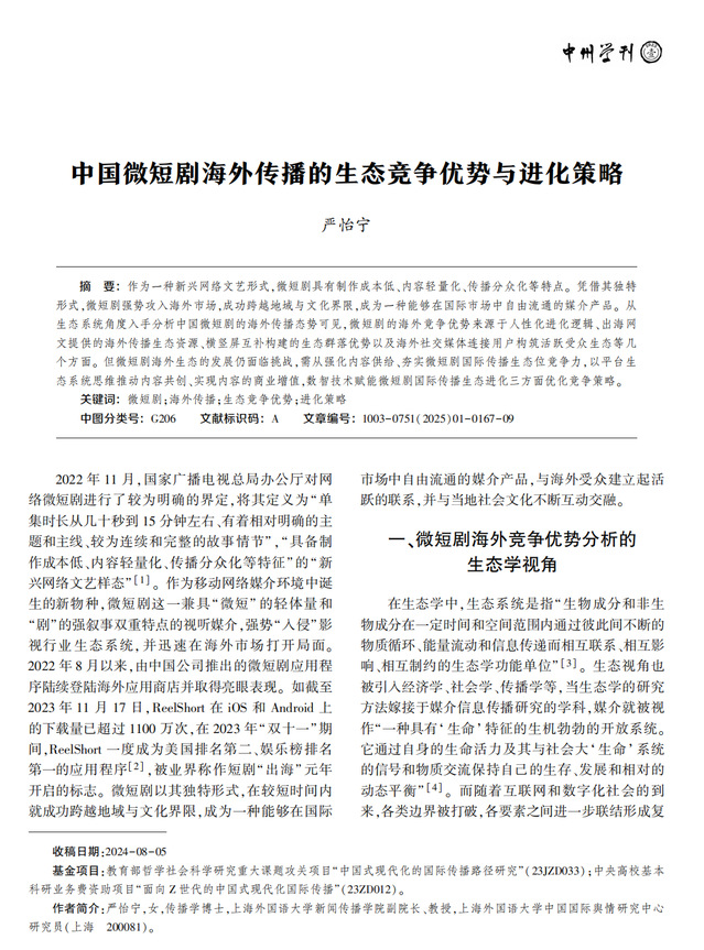 【摘要】作为一种新兴网络文艺形式,微短剧具有制作成本低、内容轻量化、传播分众化等特点。凭借其独特形式,微短剧强势攻入海外市场,成功跨越地域与文化界限,成为一种能够在国际市场中自由流通的媒介产品。从生态系统角度入手分析中国微短剧的海外传播态势可见,微短剧的海外竞争优势来源于人性化进化逻辑、出海网文提供的海外传播生态资源、横竖屏互补构建的生态群落优势以及海外社交媒体连接用户构筑活跃受众生态等几个方面。但微短剧海外生态的发展仍面临挑战,需从强化内容供给、夯实微短剧国际传播生态位竞争力,以平台生态系统思维推动内容共创、实现内容的商业增值,数智技术赋能微短剧国际传播生态进化三方面优化竞争策略。