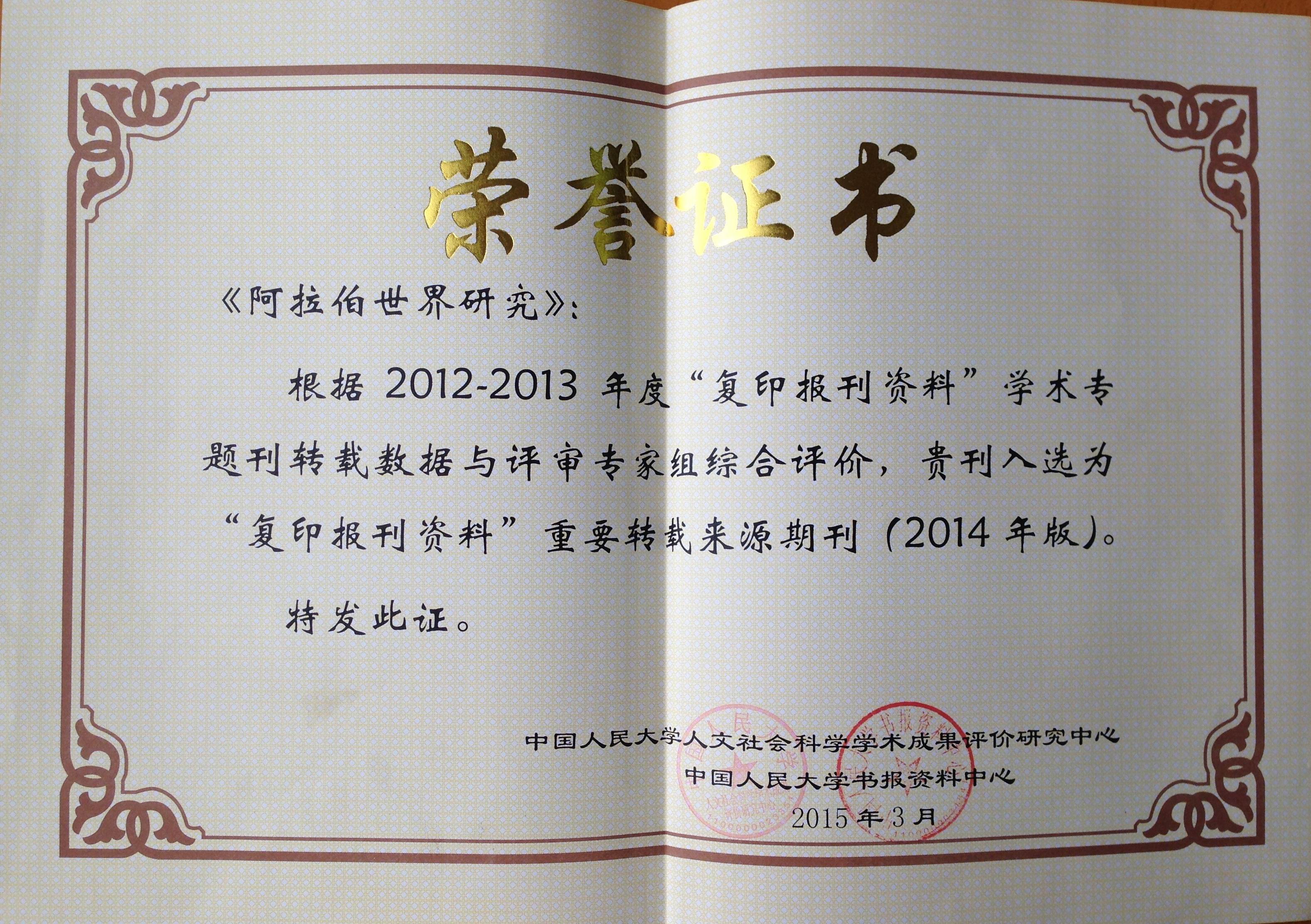 2015年3月,中国人民大学人文社科学术成果评价研究中心暨中国人民大学书报资料中心发来荣誉证书,通报并祝贺《阿拉伯世界研究》入选为“复印报刊资料”(2014年版)重要转载来源期刊。