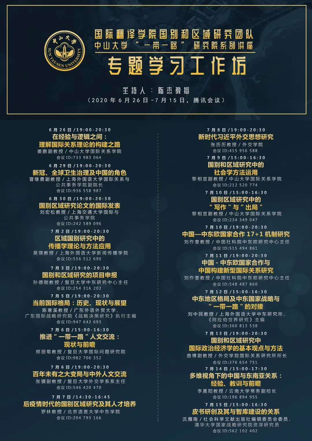 2020年7月12日下午,上外中东研究所刘中民教授应邀为中山大学国际翻译学院教师作线上学术讲座,讲座的题目为《中东地区格局及中东国家战略与“一带一路”的对接》。讲座由中山大学国际翻译学院区域与国别研究方向学科带头人陈杰教授主持。