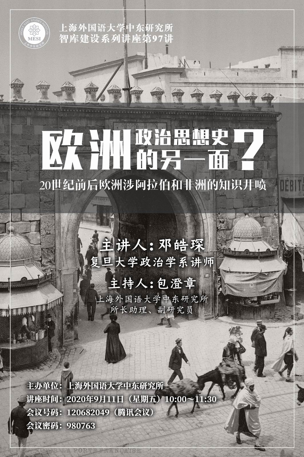 2020年9月11日,上外中东研究所智库建设系列讲座第97讲以线上直播形式举行,复旦大学政治学系讲师邓皓琛博士作了题为“欧洲政治思想史的另一面?——20世纪前后欧洲涉阿拉伯和非洲的知识井喷”的学术讲座。本场讲座是本学期智库建设系列讲座“思想讲坛”系列的第一讲,讲座由中东研究所包澄章副研究员主持。