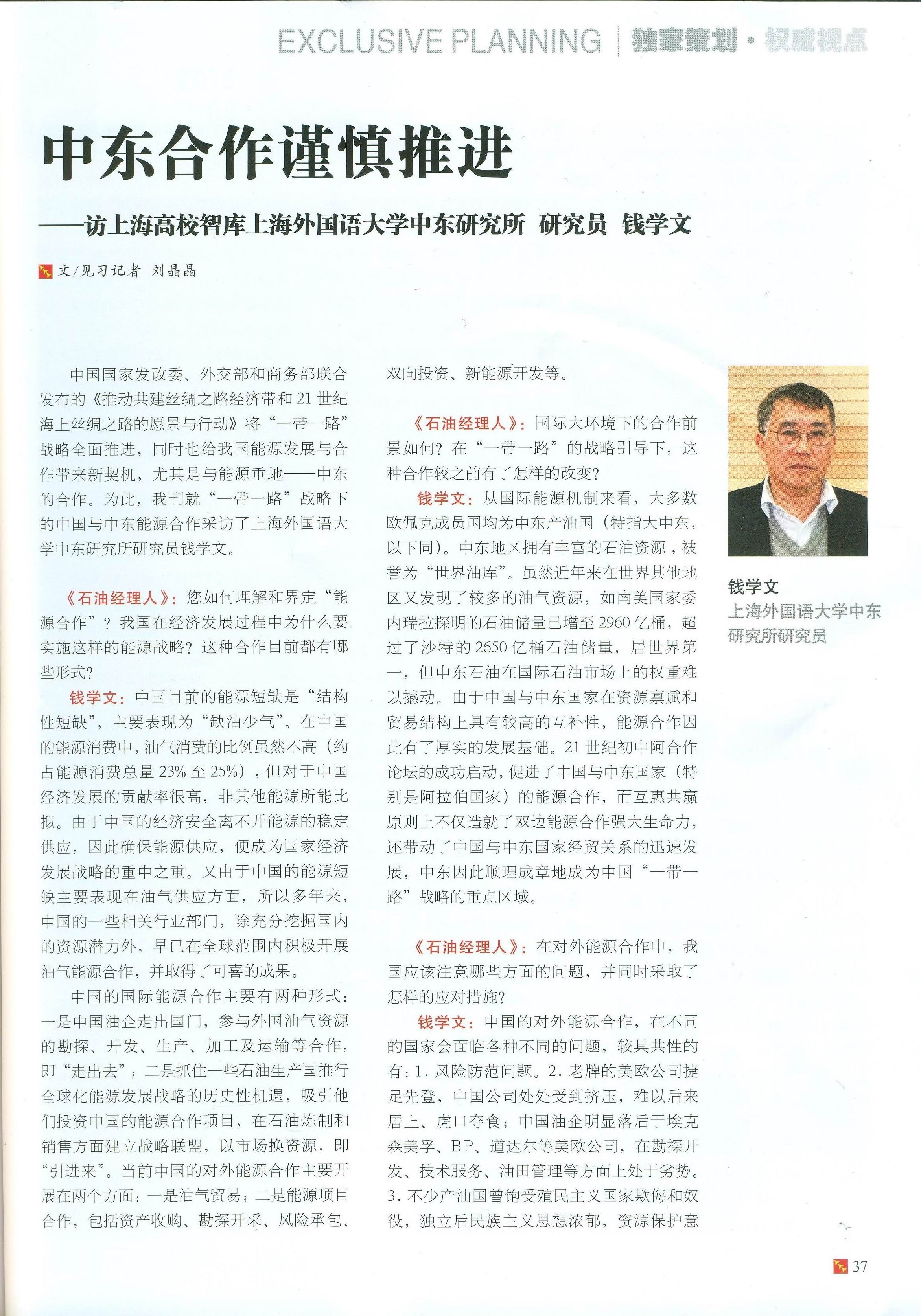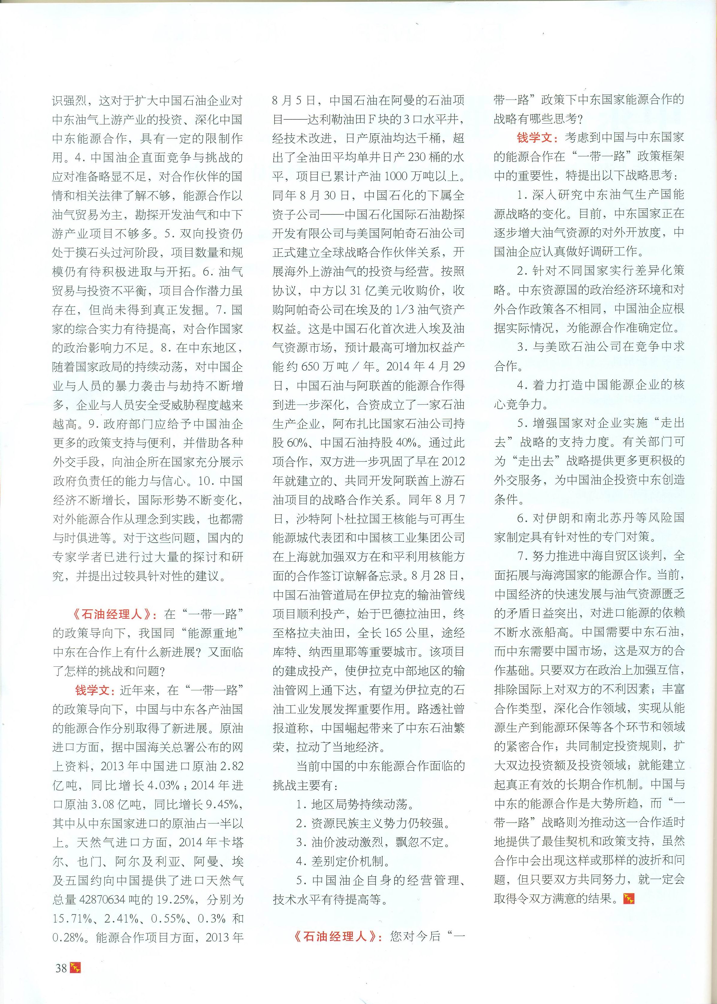2015年5月,中东研究所钱学文研究员就“一带一路”战略下中国与中东能源合作接受《石油经理人》期刊专访(见《石油经理人》2015年第5期第37~38页),全文如下: