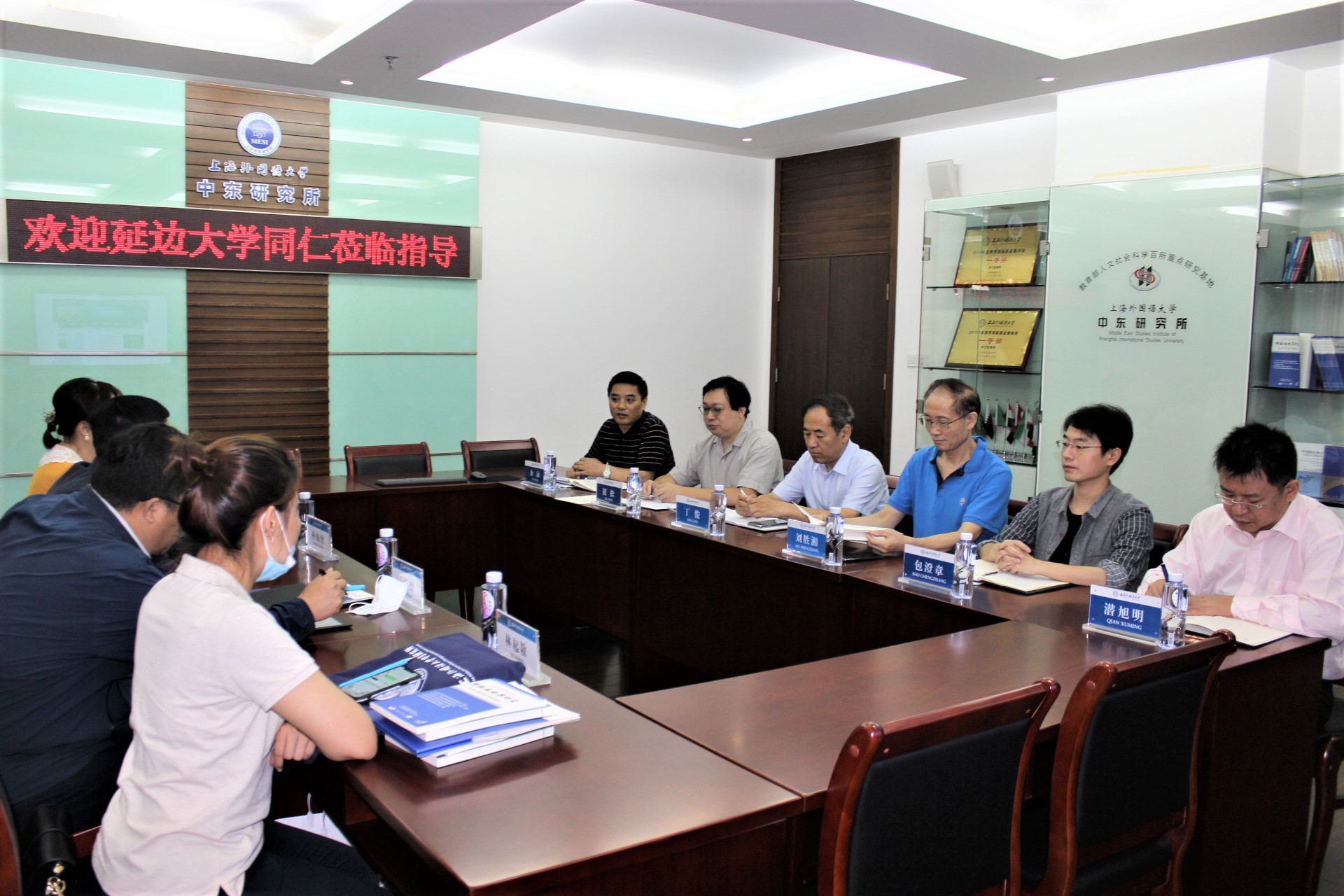 2020年9月16日上午,教育部人文社会科学重点研究基地延边大学朝鲜韩国研究中心代表团一行四人访问中东研究所,并与我所研究人员进行座谈交流。代表团成员包括朝鲜韩国研究中心主任朴灿奎、副主任谭轶操、国际政治研究所所长李金辉、办公室主任林起敬。上外副校长、中东研究所所长查明建教授因其他公务,特委托副所长余泳主持此次座谈会,中东所学者丁俊、刘胜湘、钮松、包澄章、潜旭明等出席座谈交流活动。