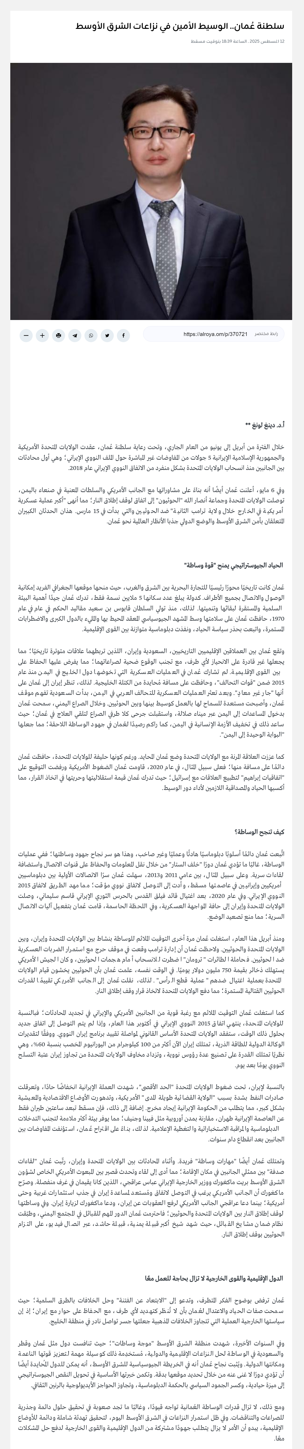 2025年8月13日,上外中东研究所丁隆教授在阿曼《观点报》发表评论文章“阿曼:中东冲突的公正调解者”(见《观点报》2025年8月13日第6版),全文如下: