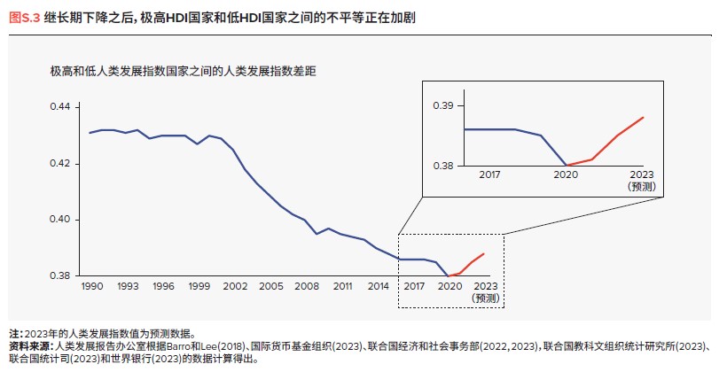 尽管全球人类发展指数据预测将创下新高,但仍将低于原本的趋势水平。全球数据掩盖了各国之间令人不安的分歧:据预测,经济合作与发展组织的每个国家都已恢复,但在最不发达国家中,大约只有一半已经恢复(图S.2)。经过20年的稳步进展,人类发展指数上下限国家之间的不平等差距已经调转方向,自2020年以来逐年加剧(图S.3)。