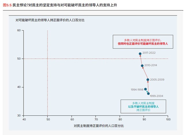 人类发展指数是衡量人类发展的一个重要标尺,尽管它稍显粗略。就在几年前,人类的福祉指数达到历史最高,贫困指数降至历史最低。然而,世界各地的人们报告悲伤、压力和担忧等负面情绪的比例居高不下(图S.4,略)。之后,近30亿人的此类自主报告指标都有所上升。尽管90%的人表现出对民主理想的坚定支持,但支持可能破坏民主理想的领导人的人数却有所增加:如今,超过一半的全球人口支持这样的领导人,如此情形在历史上尚属首次(图S.5)。